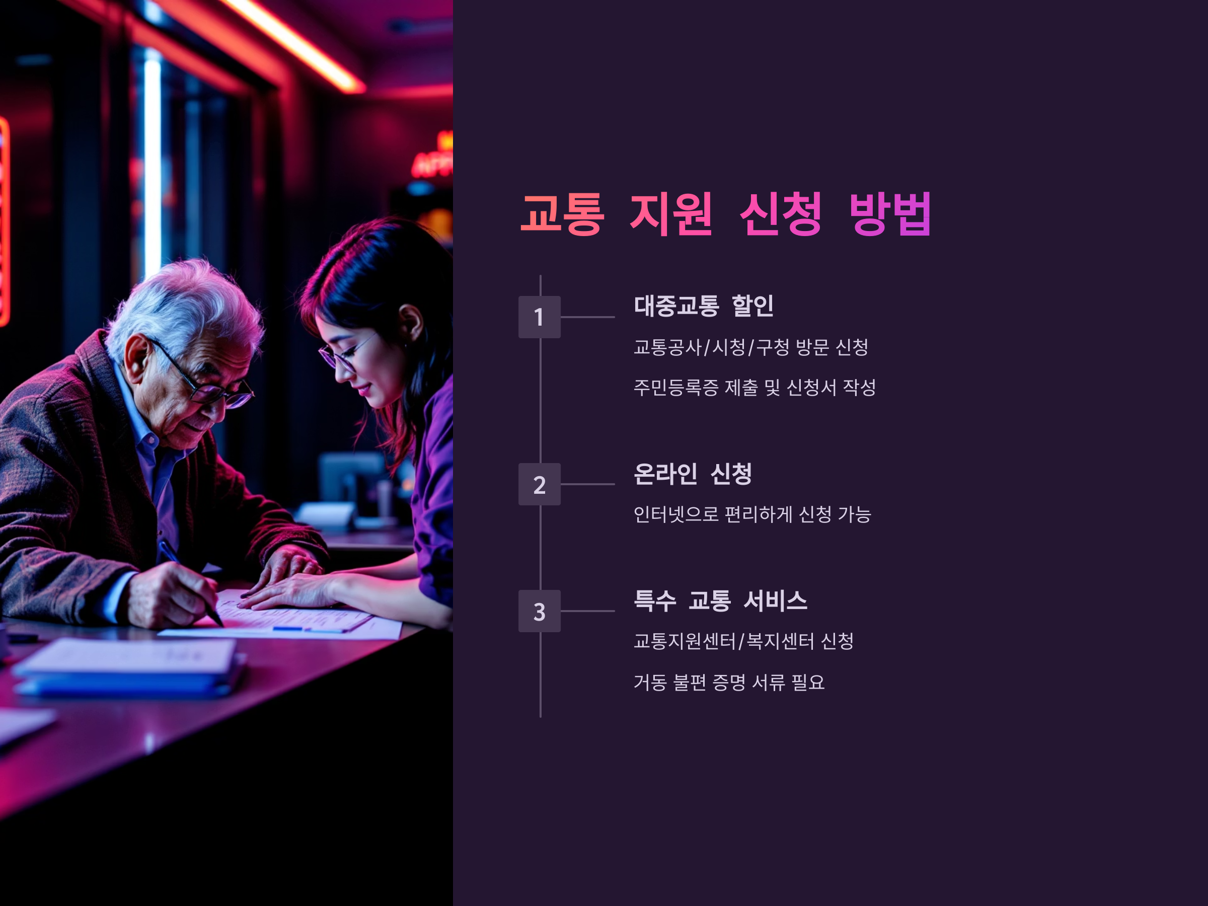 대중교통 할인 혜택을 받기 위해서는 해당 지역의 교통공사나 시청, 구청에서 신청할 수 있습니다. 보통 주민등록증을 제출하고, 연령을 확인한 후 신청서를 작성하면 됩니다. 온라인 신청이 가능할 경우, 인터넷을 통해 신청하는 방법도 있으니, 이를 활용하면 더욱 편리하게 혜택을 받을 수 있습니다.