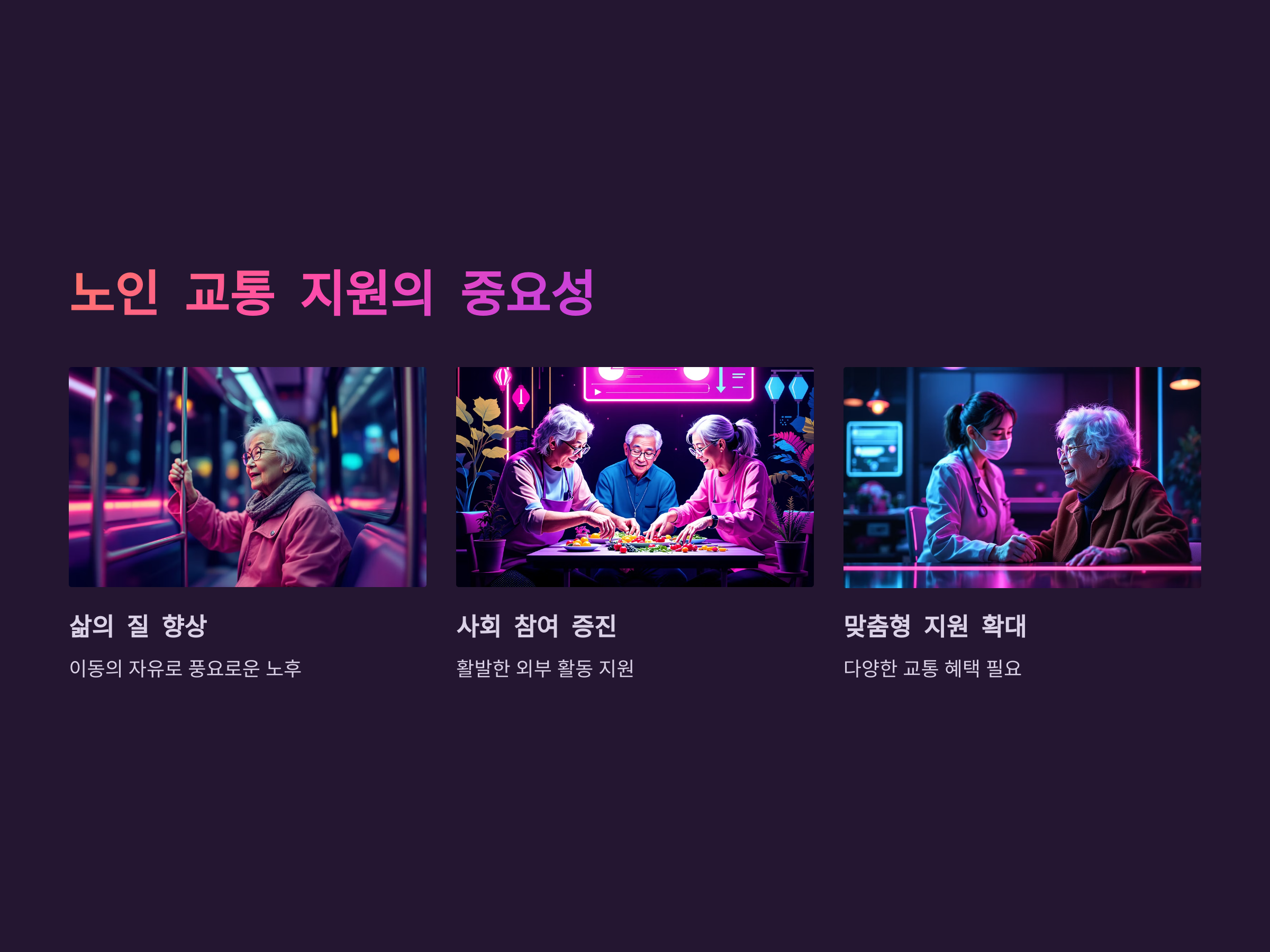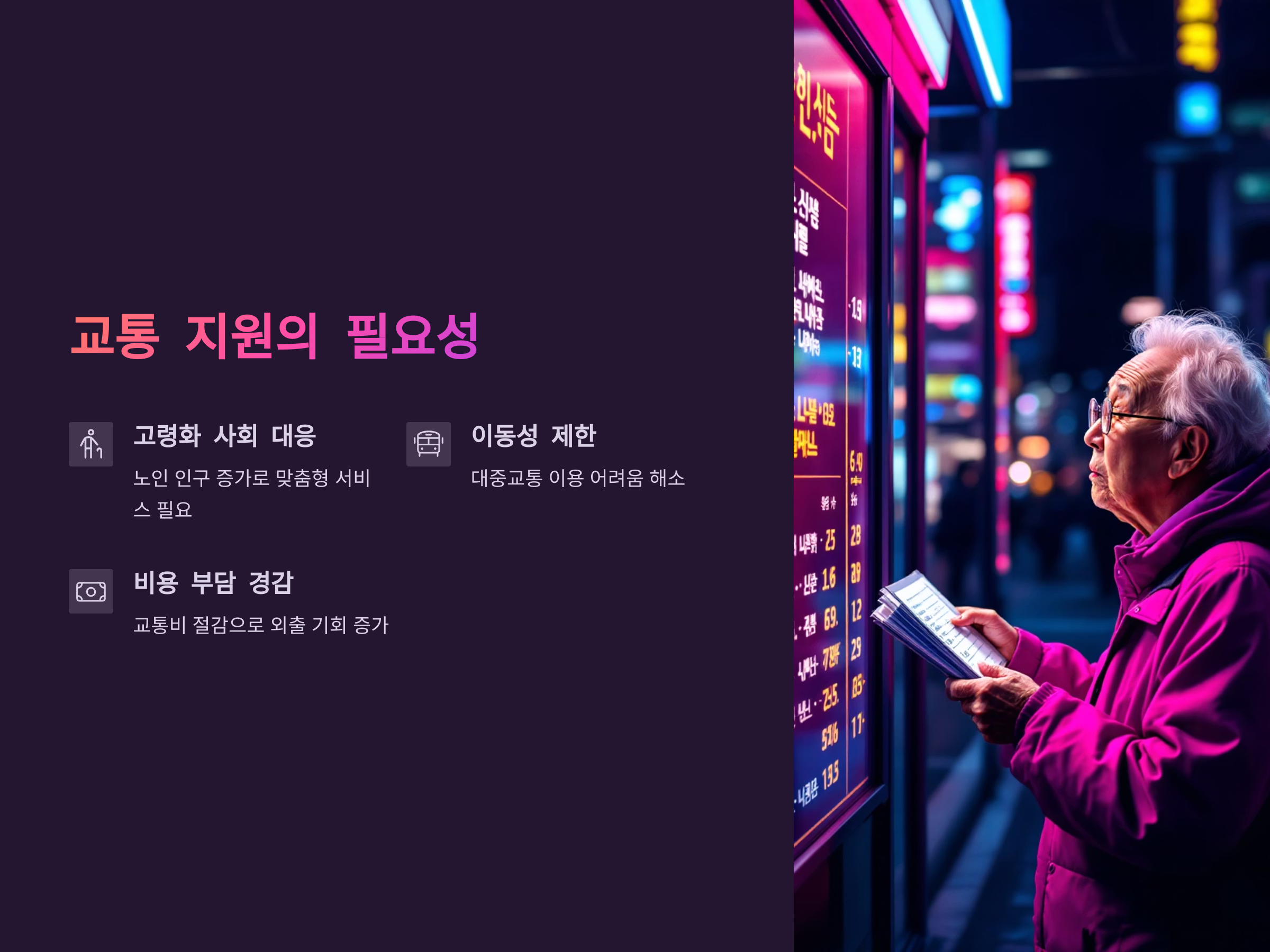 노인을 위한 맞춤형 교통 지원 혜택은 단순히 이동 수단을 제공하는 것 이상의 중요한 역할을 합니다. 노인들의 삶의 질을 향상시키고, 사회적 활동을 장려하며, 정신적·신체적 건강에도 긍정적인 영향을 미칩니다. 이러한 혜택은 정부와 지자체에서 지속적으로 확대할 필요가 있으며, 노인들이 안전하고 편리하게 이동할 수 있는 환경을 만들어가는 것이 중요합니다.