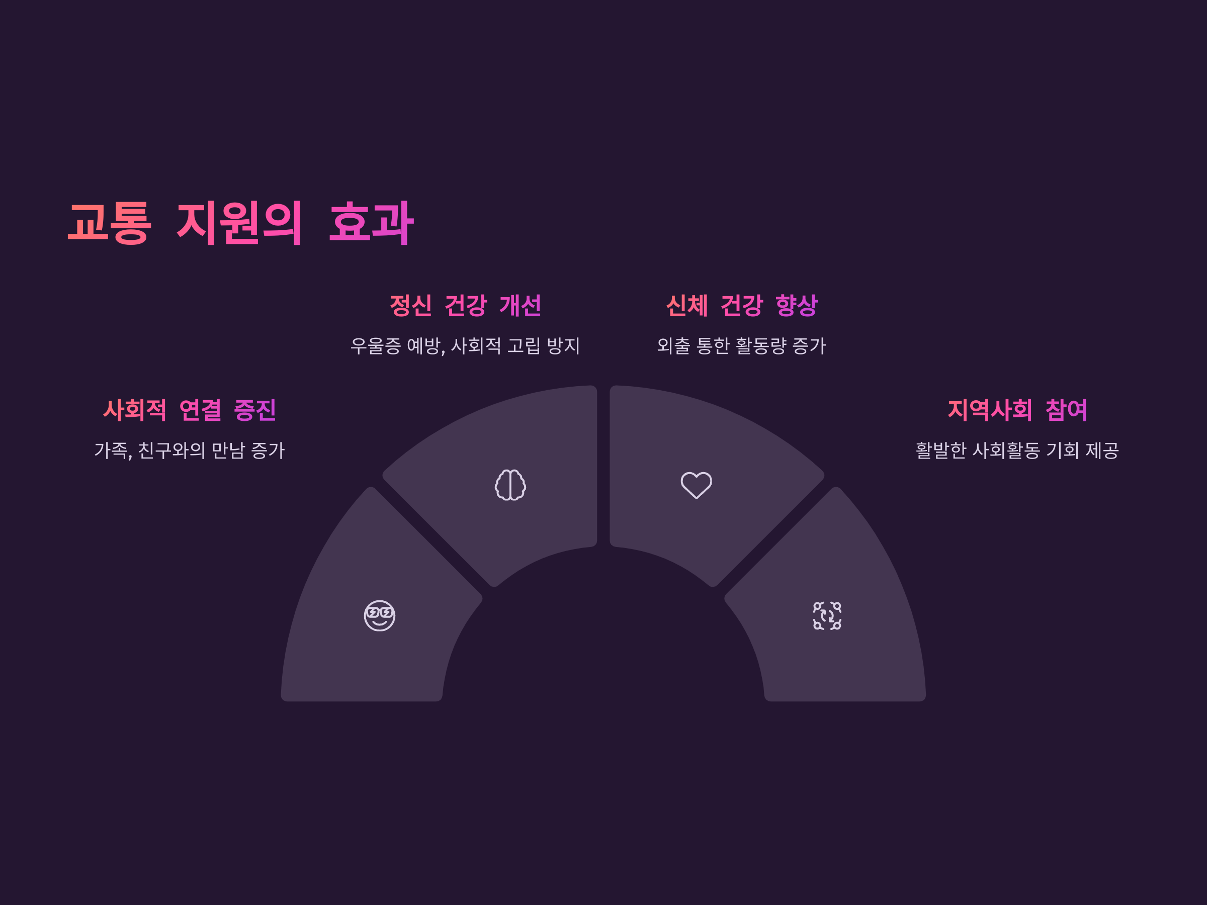 교통 지원 혜택을 통해 노인들은 외출이 자유로워지며, 가족, 친구들과의 만남이 많아집니다. 이는 사회적 연결을 강화하고, 노인의 삶의 질을 향상시키는 데 중요한 역할을 합니다. 또한, 지역 사회에서 활발히 활동할 수 있는 기회를 제공하여 고립된 생활을 방지하는 효과가 있습니다.