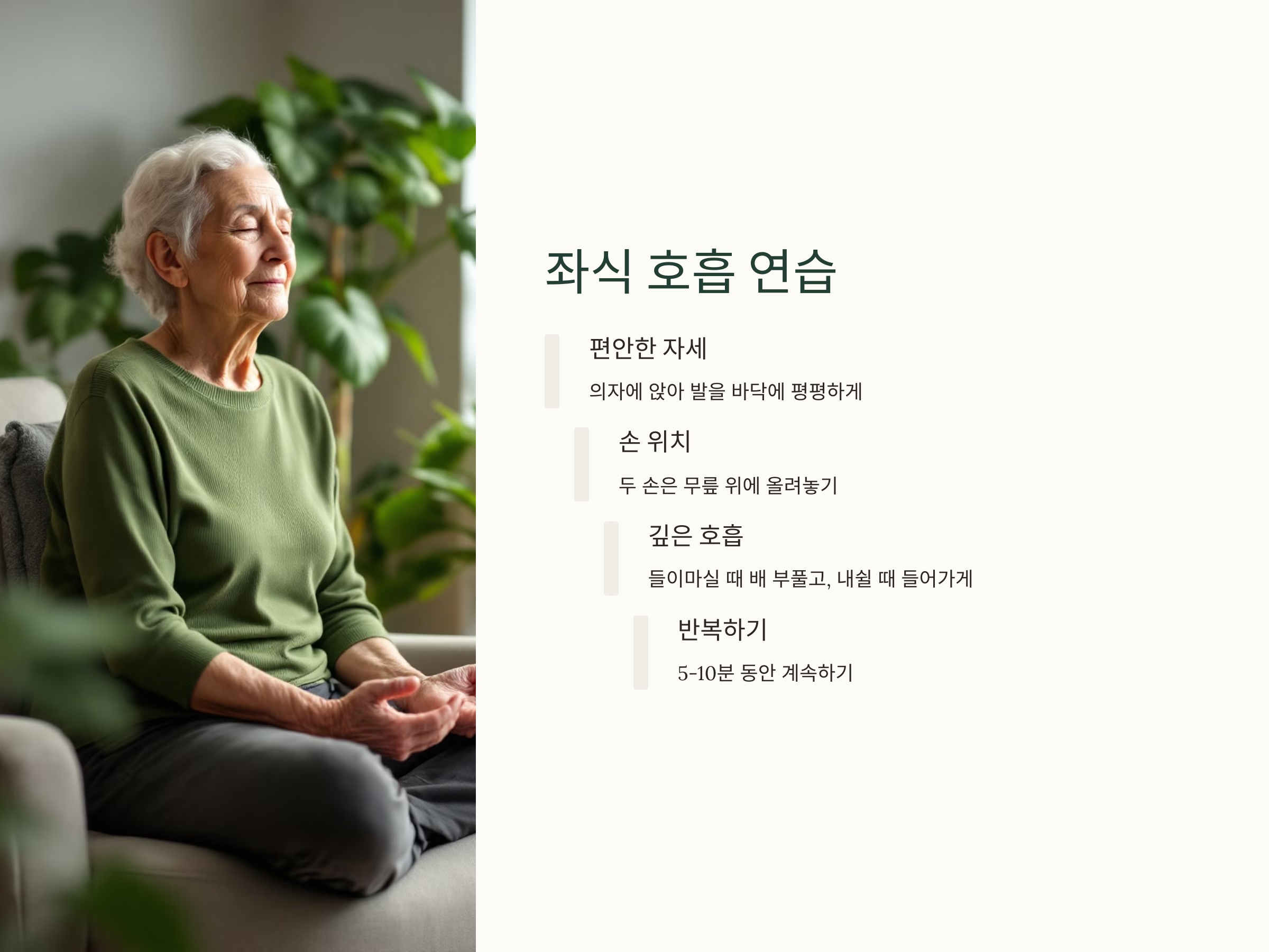 이 동작은 요가의 가장 기본적인 호흡 훈련으로, 노인의 정신적 안정과 스트레스 완화에 도움을 줄 수 있습니다.
