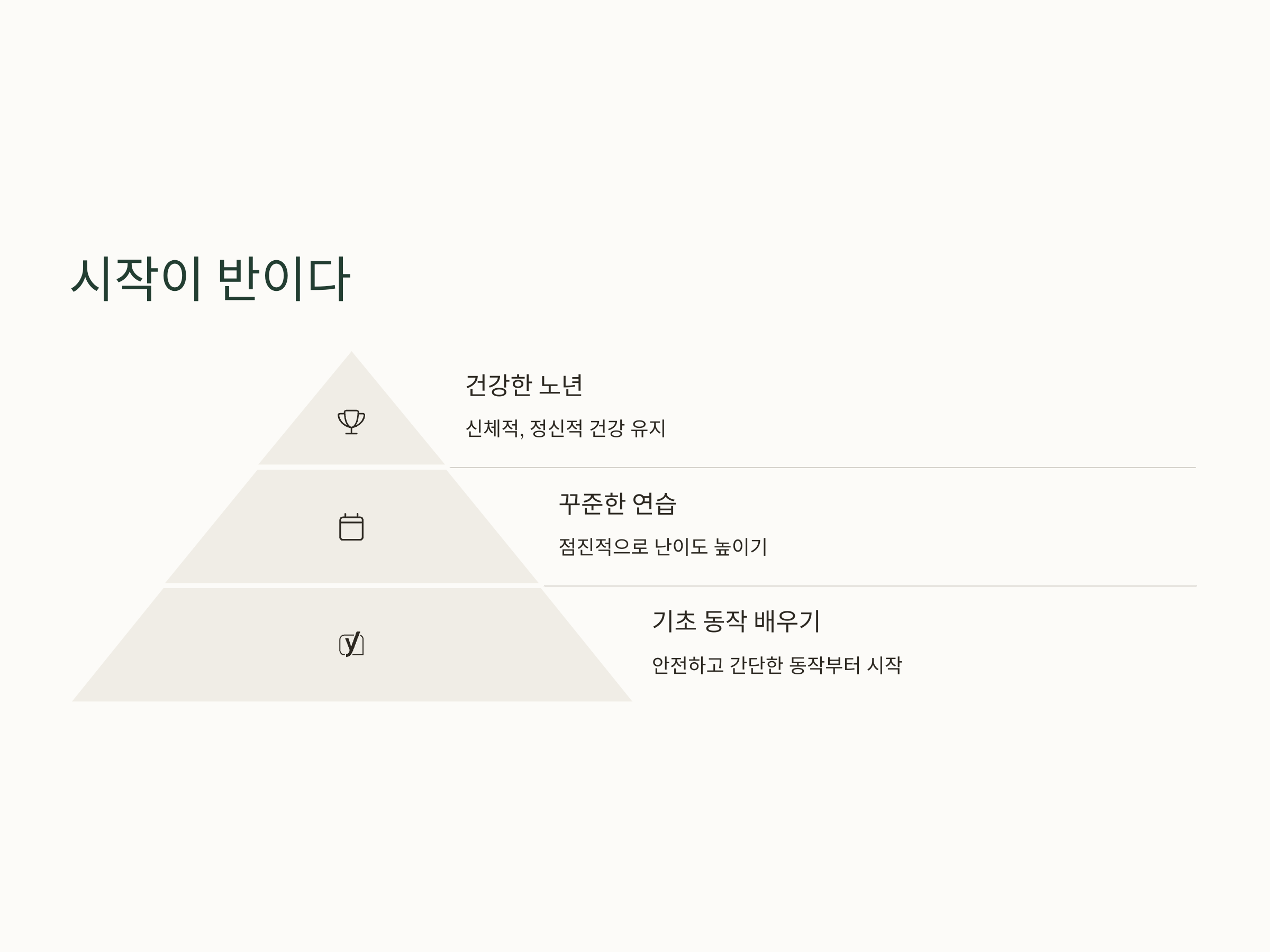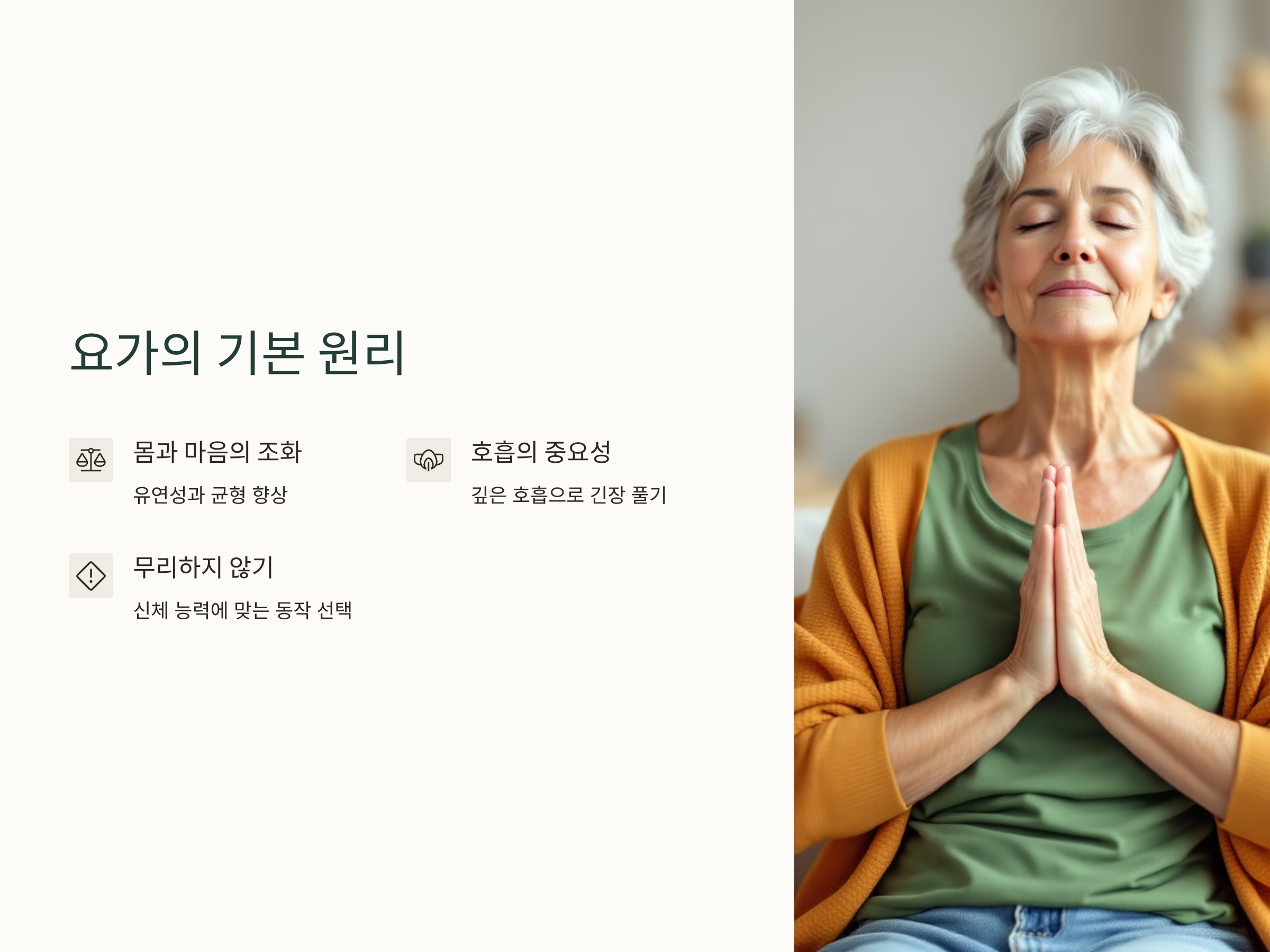 이러한 기본 원리를 바탕으로, 노인들이 쉽게 따라 할 수 있는 기초 요가 동작을 배우는 것이 첫걸음입니다.