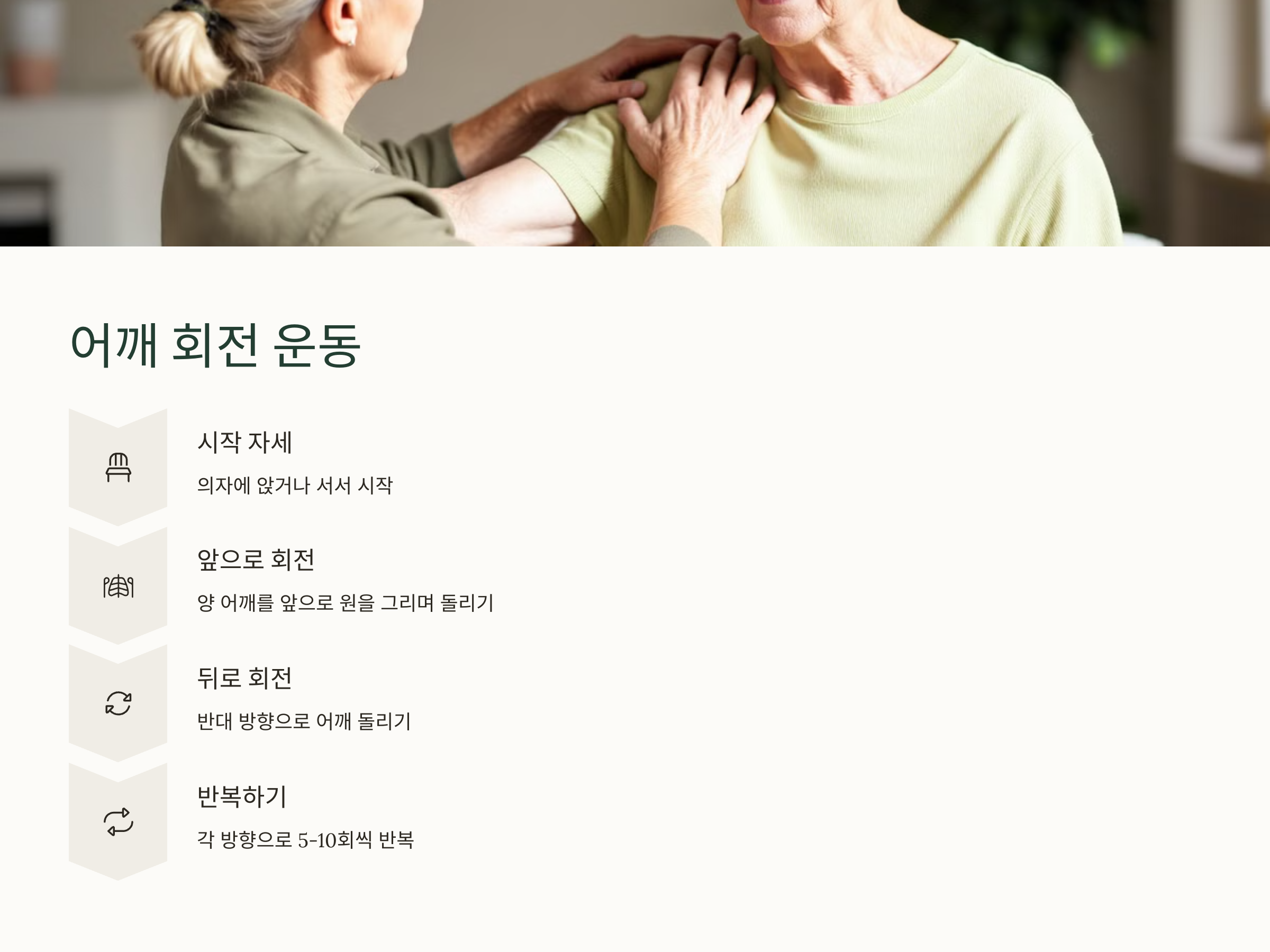 어깨는 노인들이 자주 문제가 생기는 부위입니다. 어깨를 부드럽게 회전시켜주면, 긴장된 근육을 풀어주고 유연성을 개선할 수 있습니다.