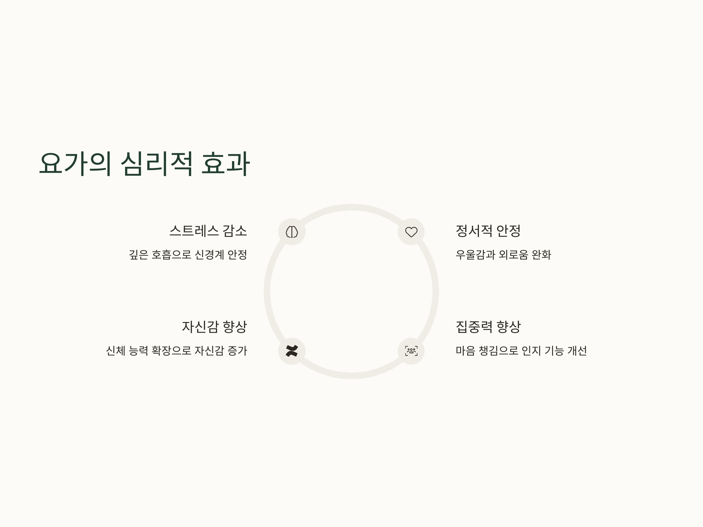 요가는 신체적인 이점 외에도 정신적인 이점이 매우 큽니다. 요가를 통해 스트레스를 해소하고, 심리적인 안정을 찾을 수 있으며, 집중력과 감정 조절 능력을 향상시킬 수 있습니다. 특히 노인들에게 요가는 외로움이나 우울감을 완화하는 데 효과적인 방법이 될 수 있습니다.