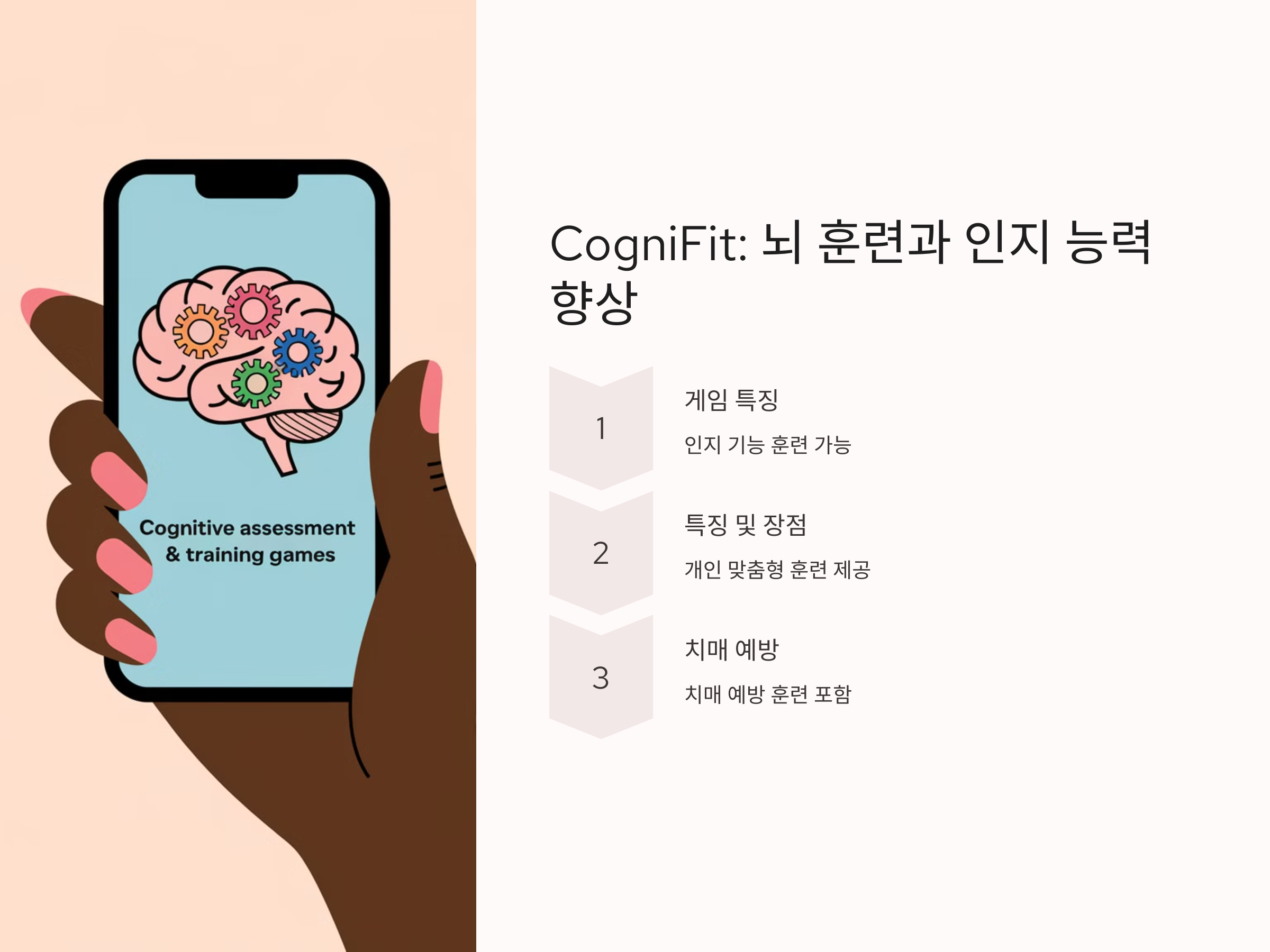 - CogniFit은 여러 가지 인지 기능을 훈련할 수 있는 앱으로, 기억력, 집중력, 문제 해결 능력 등을 향상시킬 수 있는 다양한 게임을 제공합니다. 이 앱은 특히 인지 훈련을 통해 치매 예방에 도움을 줄 수 있다고 알려져 있으며, 사용자 맞춤형 훈련 프로그램을 제공합니다.