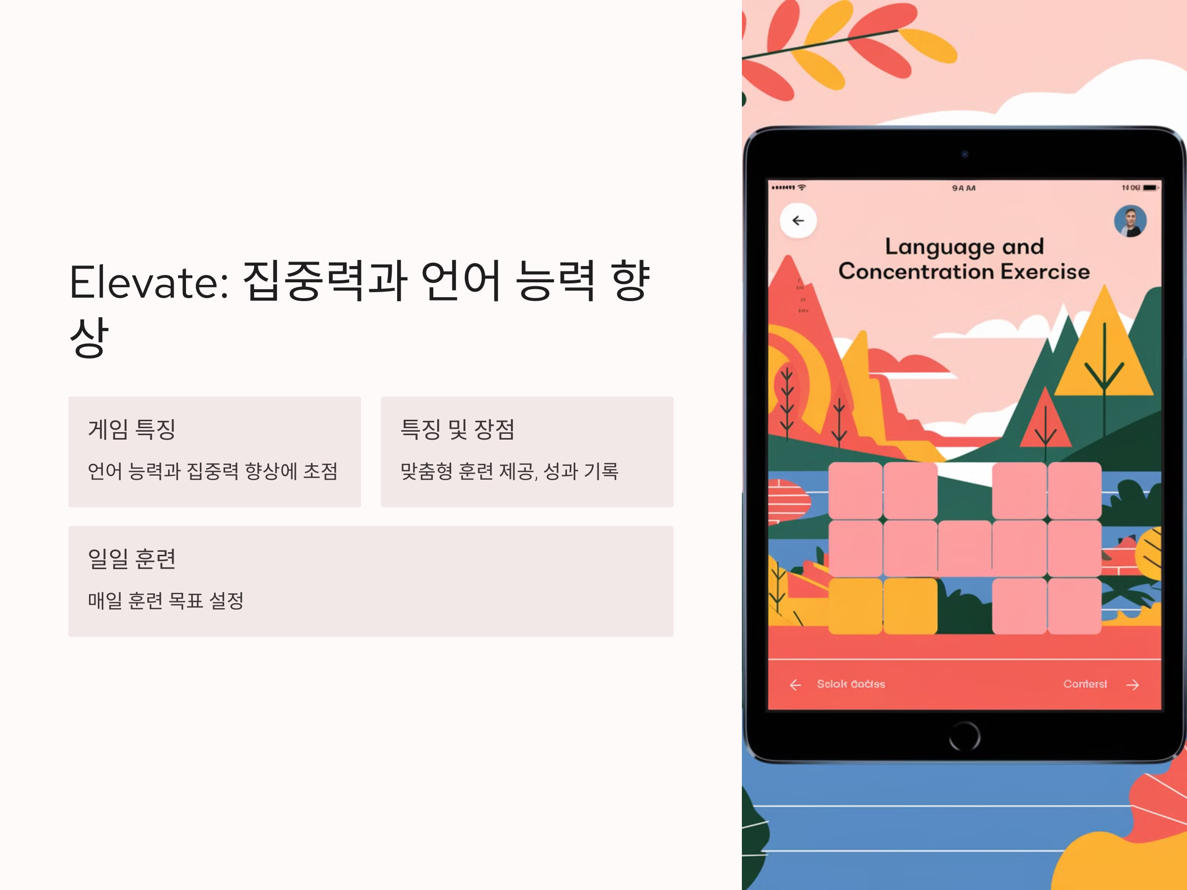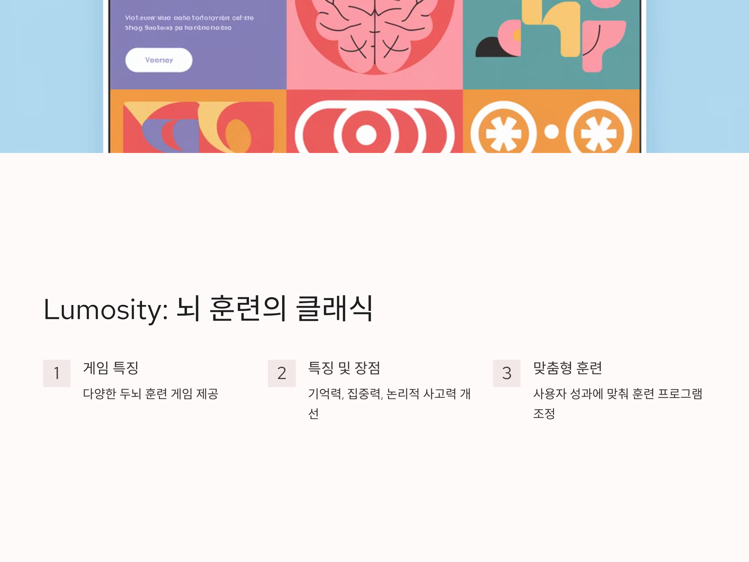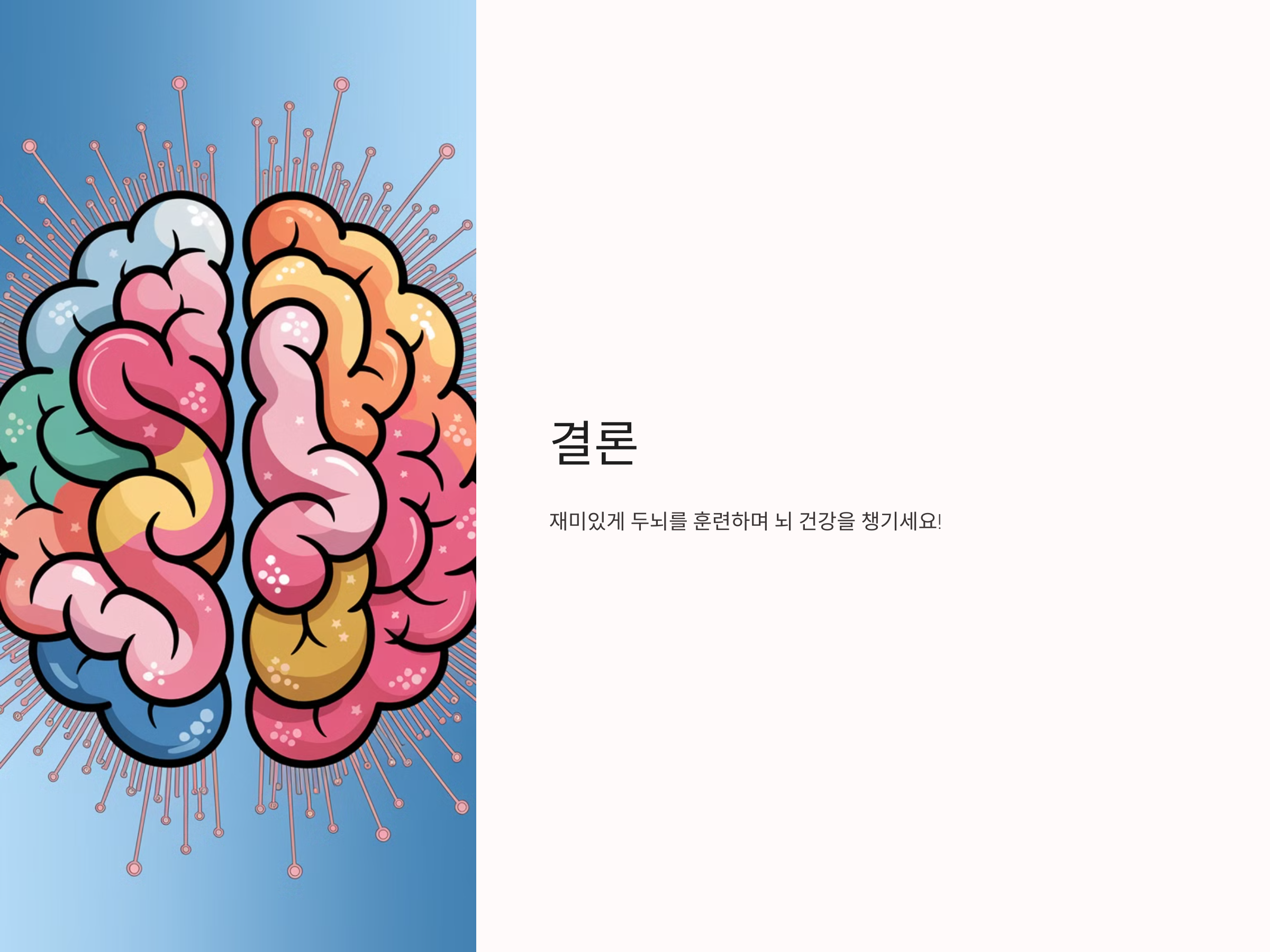 - 게임 종류: 기억력 훈련, 집중력 향상, 논리적 사고력 개선 등