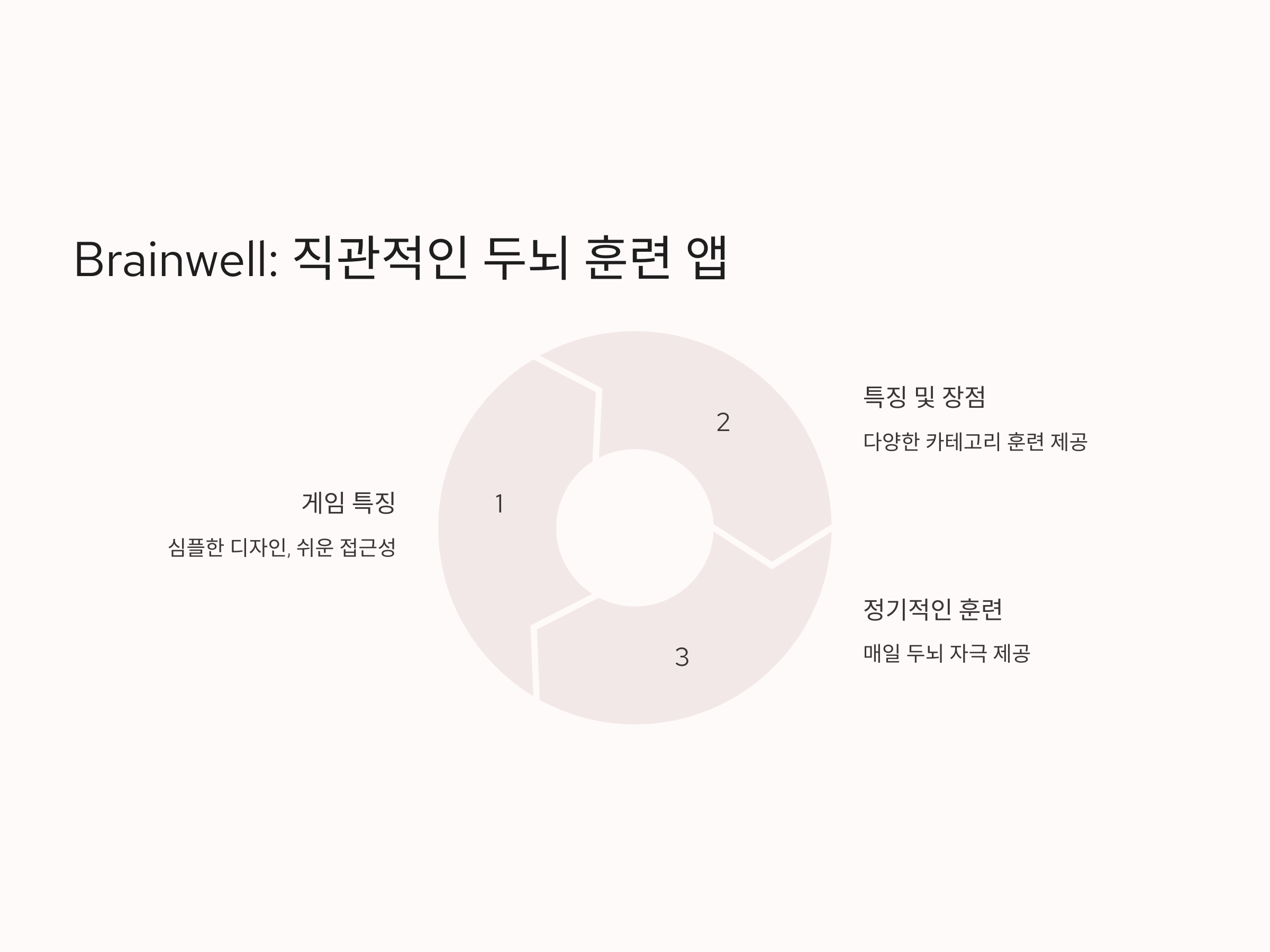 - Brainwell은 심플한 디자인과 직관적인 인터페이스로 사용자가 쉽게 접근할 수 있는 두뇌 훈련 앱입니다. 이 앱은 기억력, 집중력, 반응 속도 등을 개선할 수 있는 게임을 제공하며, 난이도는 점차적으로 상승하여 사용자가 지속적으로 두뇌를 훈련할 수 있습니다.