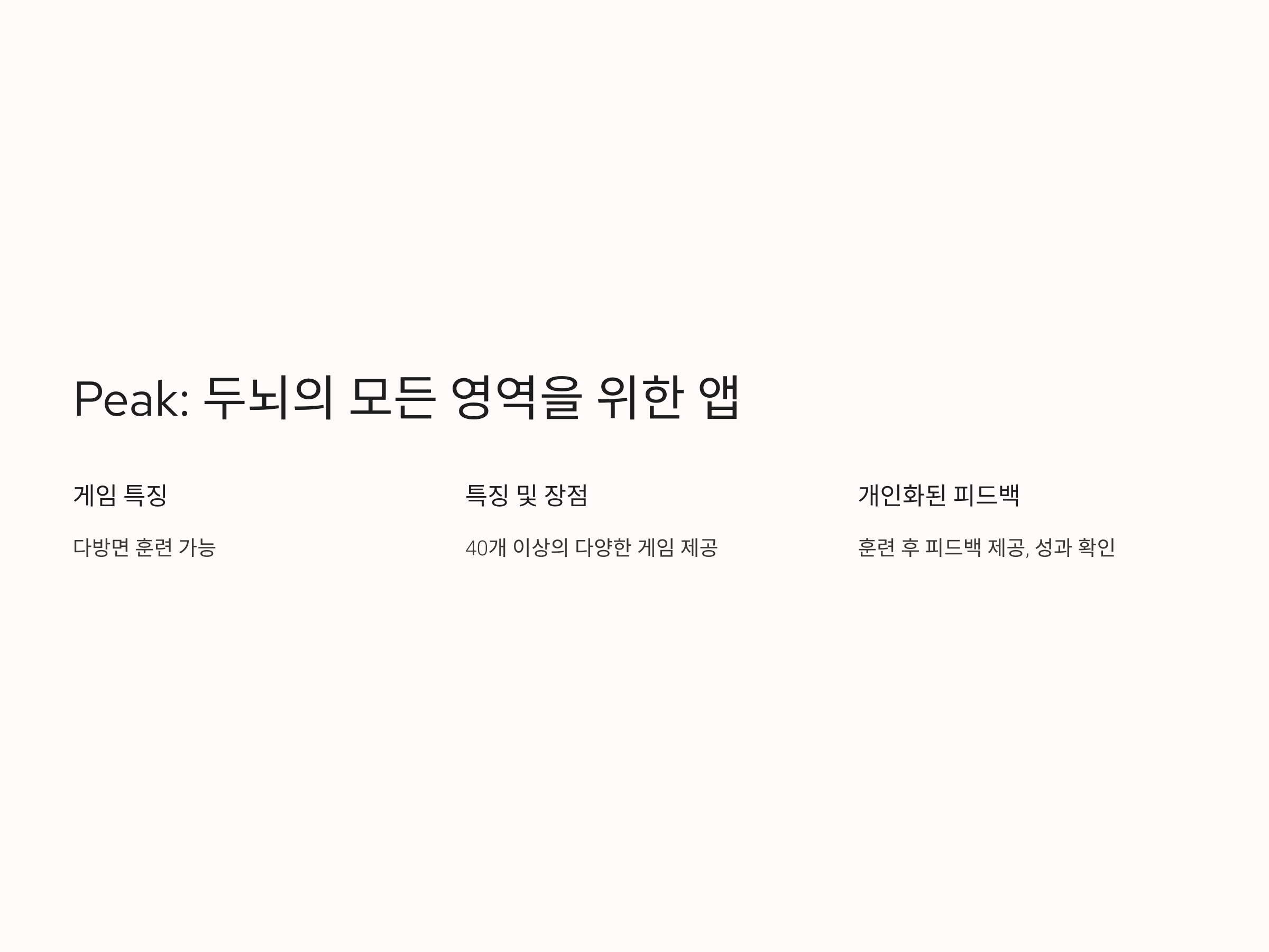 - Peak은 사용자의 두뇌 능력을 다방면에서 훈련할 수 있도록 다양한 게임을 제공합니다. 이 앱은 기억력, 언어, 집중력, 문제 해결 능력 등 다양한 두뇌 기능을 종합적으로 개발할 수 있는 기능을 제공합니다. 각 게임은 뇌 기능을 자극하고, 성과를 기록하여 사용자가 지속적으로 발전할 수 있게 돕습니다.
