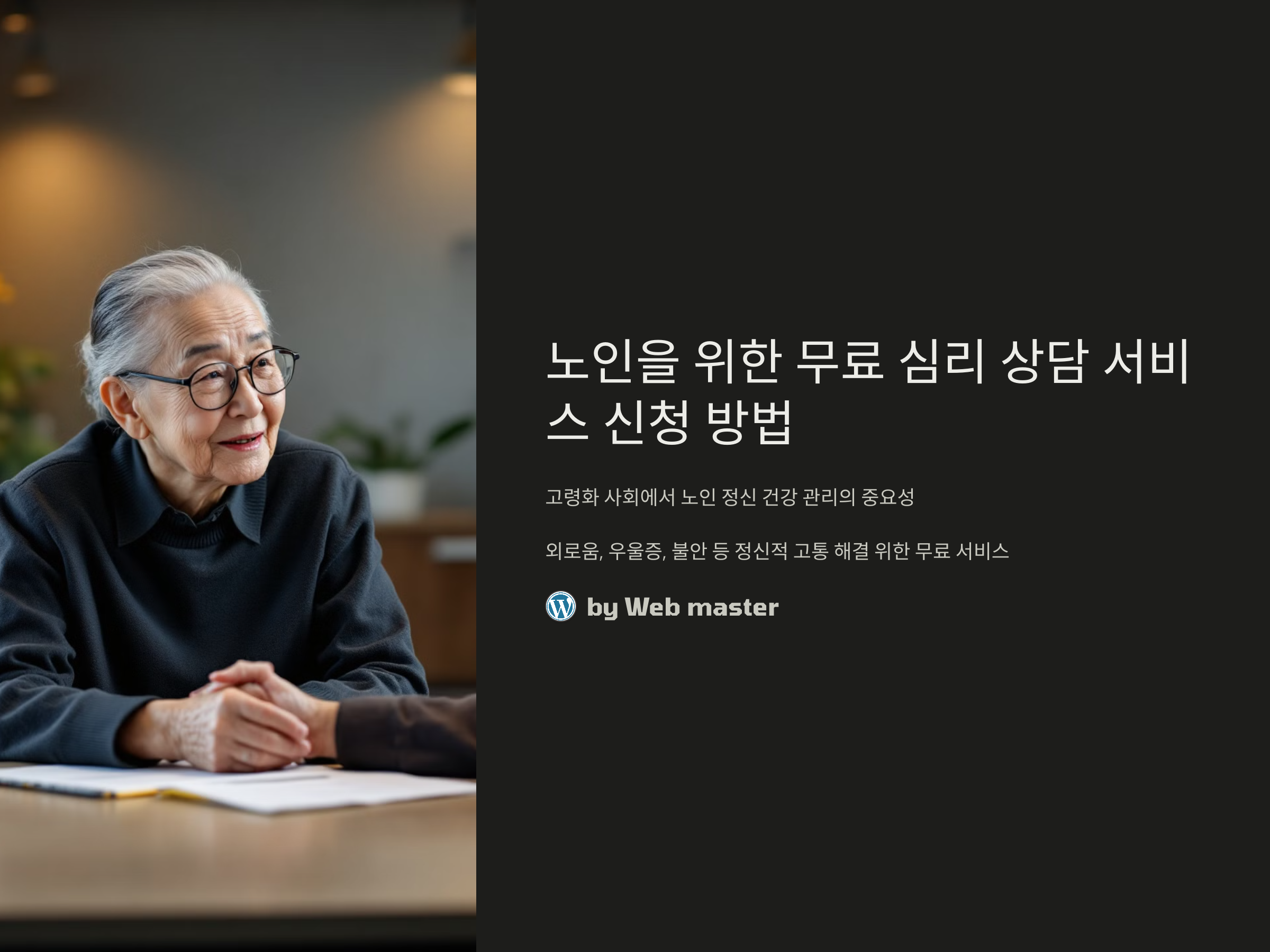 지금 바로 무료 심리 상담 서비스를 신청하여, 보다 건강하고 행복한 노후를 보내기 위한 첫 걸음을 떼어보세요.