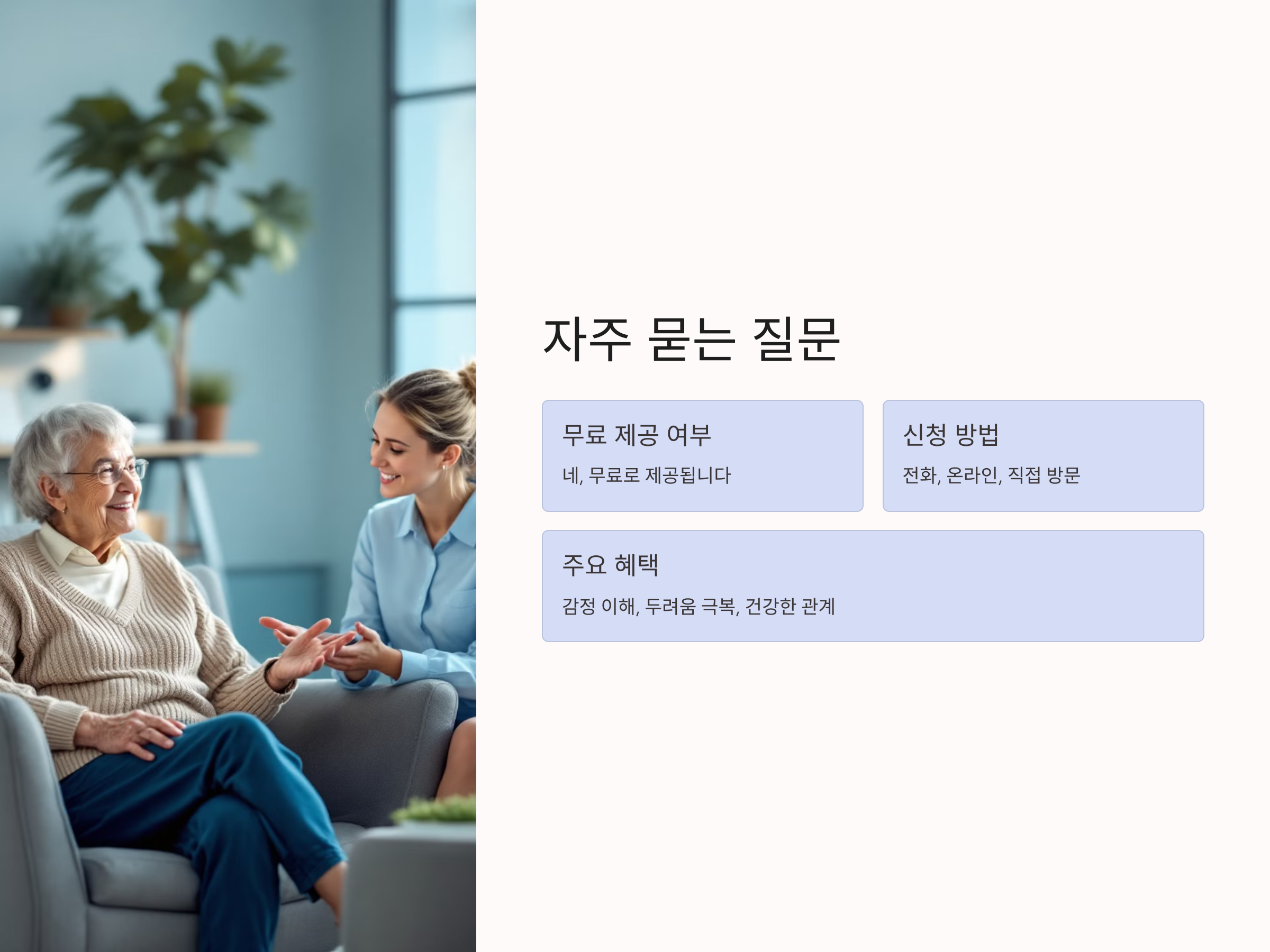 연애나 감정 문제로 고민하는 노인들이 심리적으로 안정될 수 있는 기회를 제공합니다. 상담을 통해 자신의 감정을 솔직하게 표현하고, 더 나아가 상대방과의 관계에서 어떻게 행동해야 할지에 대한 조언을 받을 수 있습니다.