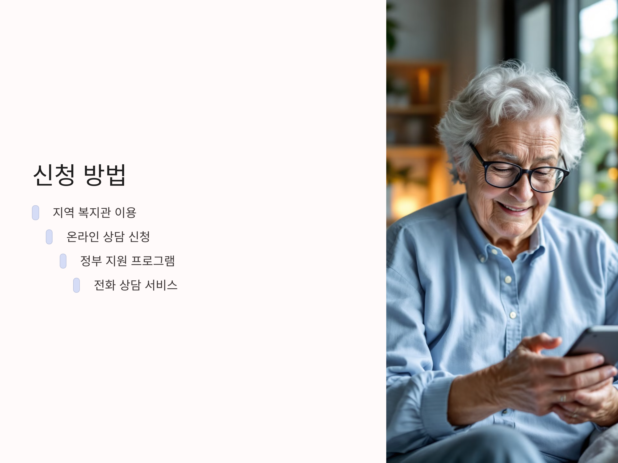 노인을 위한 무료 연애 심리 상담 서비스는 다양한 방법으로 신청할 수 있습니다. 대부분의 경우, 지역 사회 복지관이나 관련 기관에서 이러한 서비스를 제공하고 있으며, 온라인으로도 신청할 수 있는 방법이 많습니다. 구체적인 신청 방법에 대해 알아보겠습니다.
