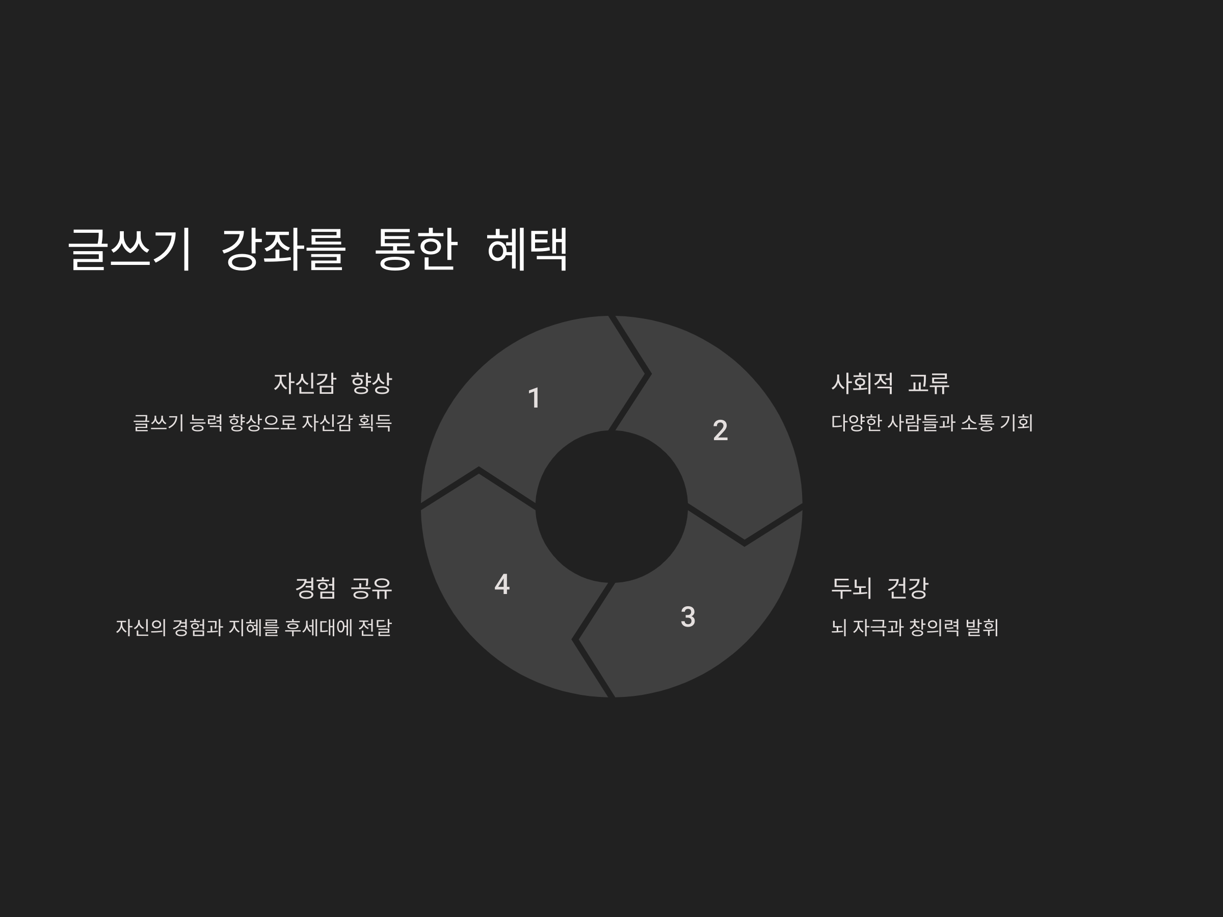 글쓰기는 생각을 정리하고 감정을 표현하는 강력한 도구이기도 합니다. 노인분들이 글쓰기를 시작하면서, 자신만의 경험을 글로 남기고, 후세대에게 지혜를 전하는 방법을 배울 수 있습니다. 또한, 글을 쓰는 과정에서 뇌를 자극하고, 창의력을 발휘하는 기회가 되므로, 두뇌 건강에도 매우 유익합니다.