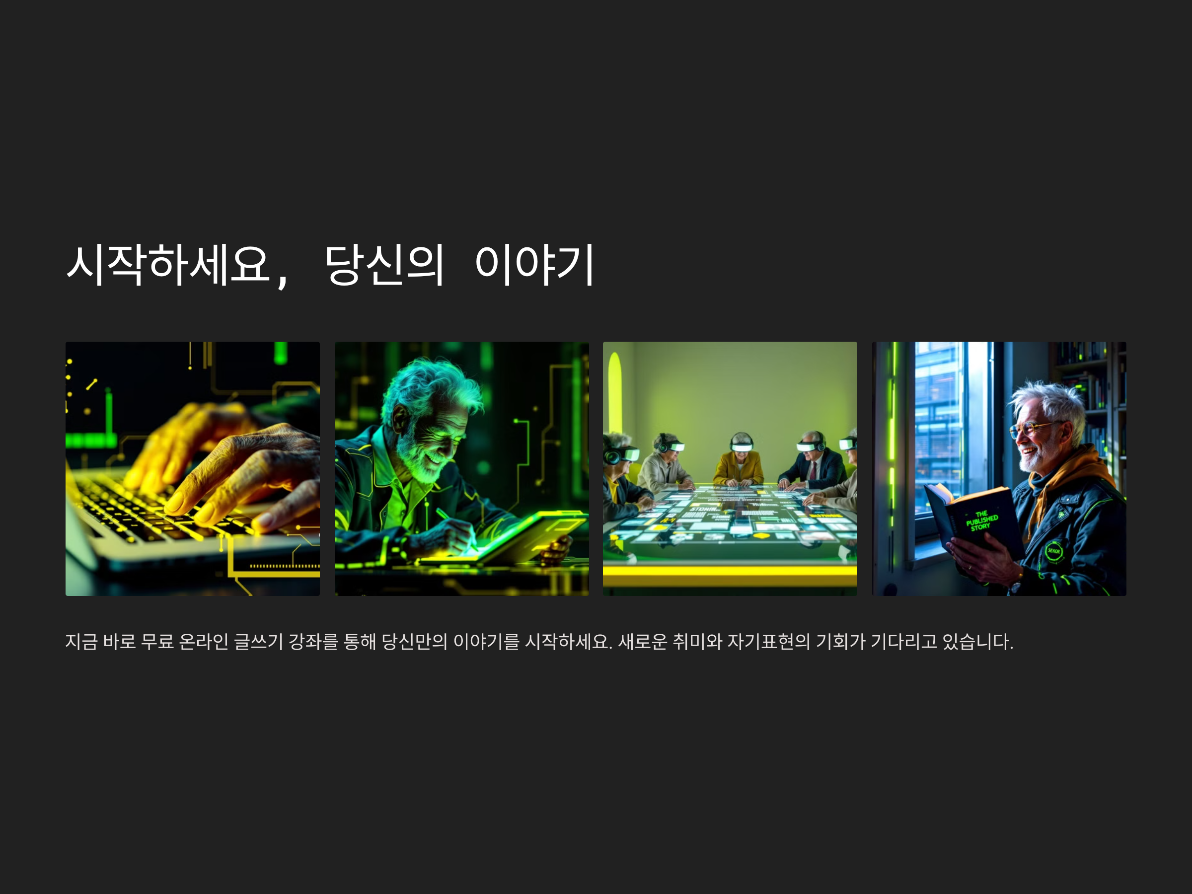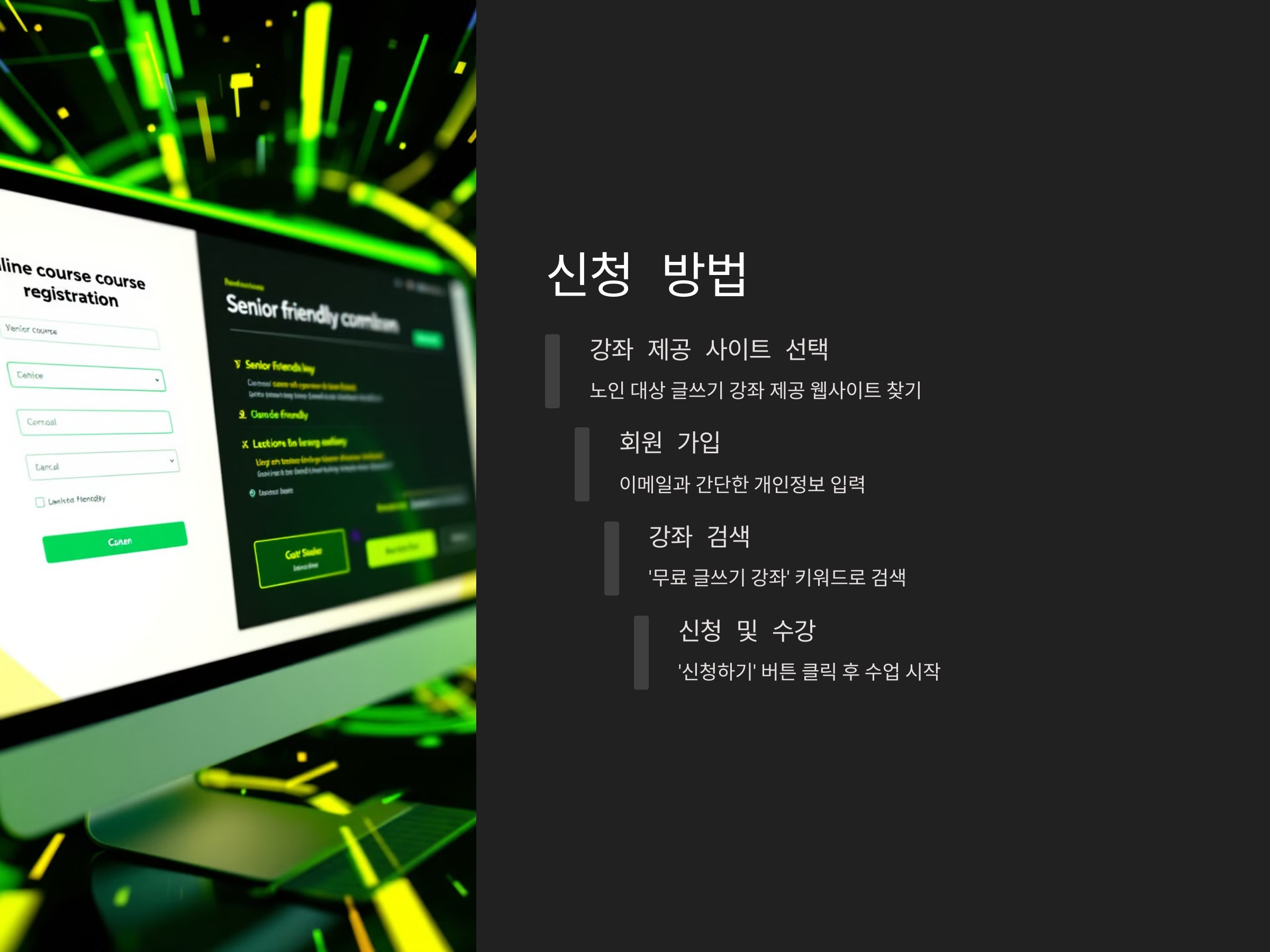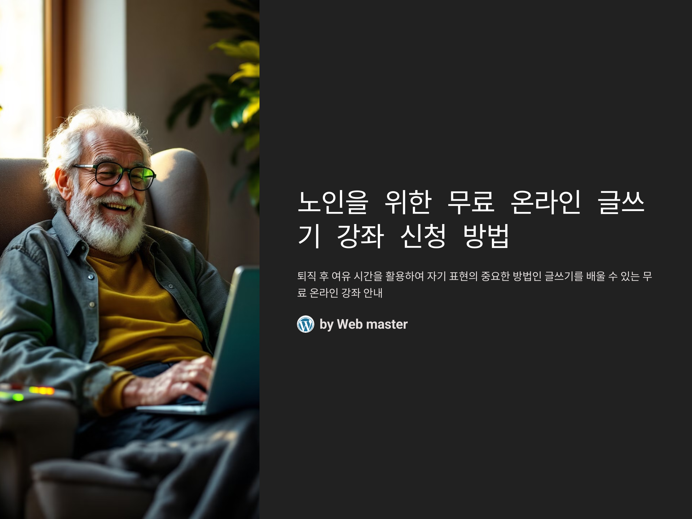- 강좌 검색: 홈페이지에서 '무료 글쓰기 강좌' 또는 '노인 대상 글쓰기' 등의 키워드를 입력하여 원하는 강좌를 찾습니다.