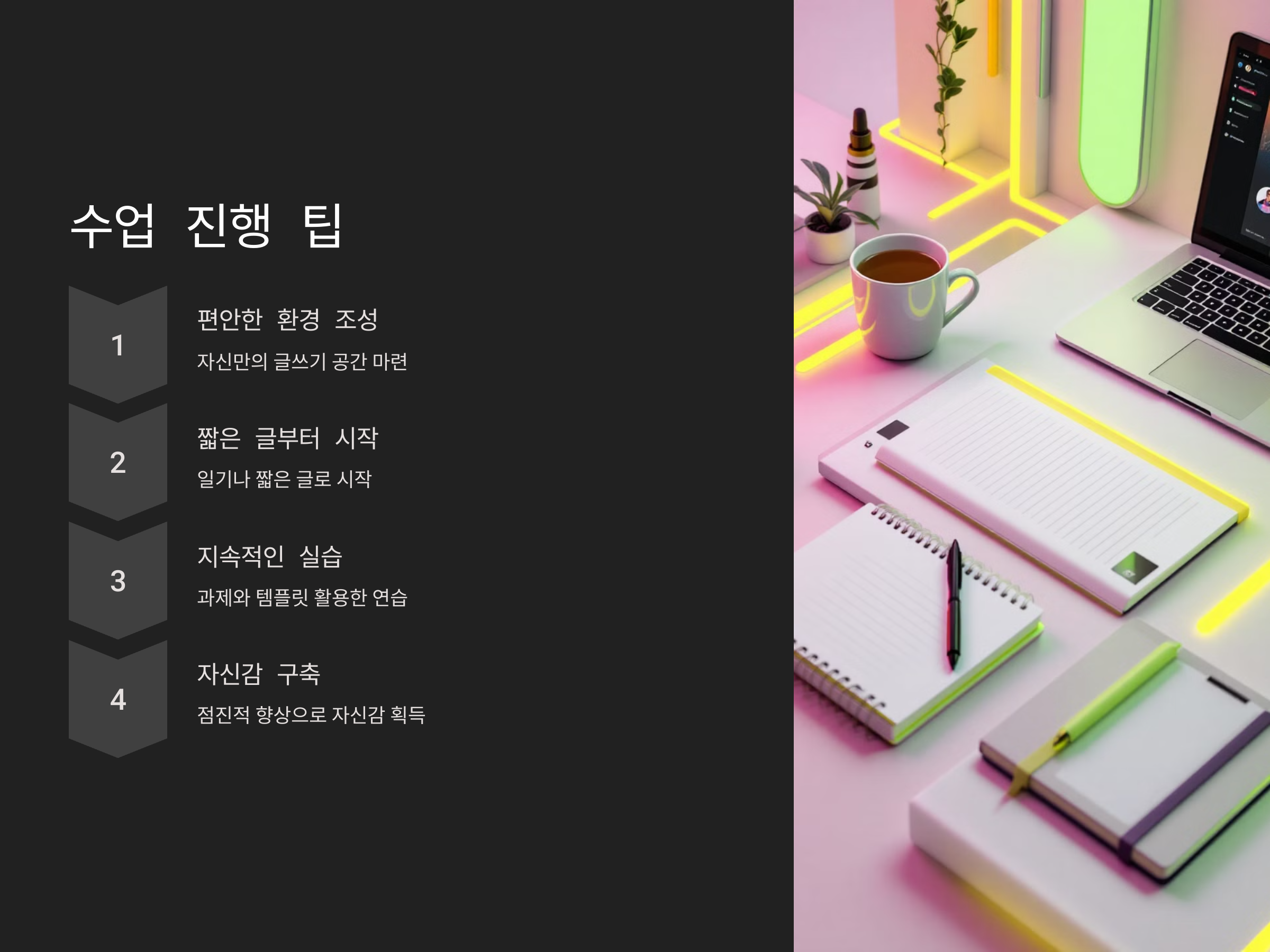 또한, 글을 쓸 때 일기나 짧은 글부터 시작해보세요. 처음에는 짧은 글이라도 지속적으로 작성하면 점점 글쓰기 능력이 향상됩니다. 강좌에서 제공하는 과제나 템플릿을 활용하여 실습을 계속해보세요. 이를 통해 자연스럽게 글쓰기에 자신감을 얻을 수 있습니다.