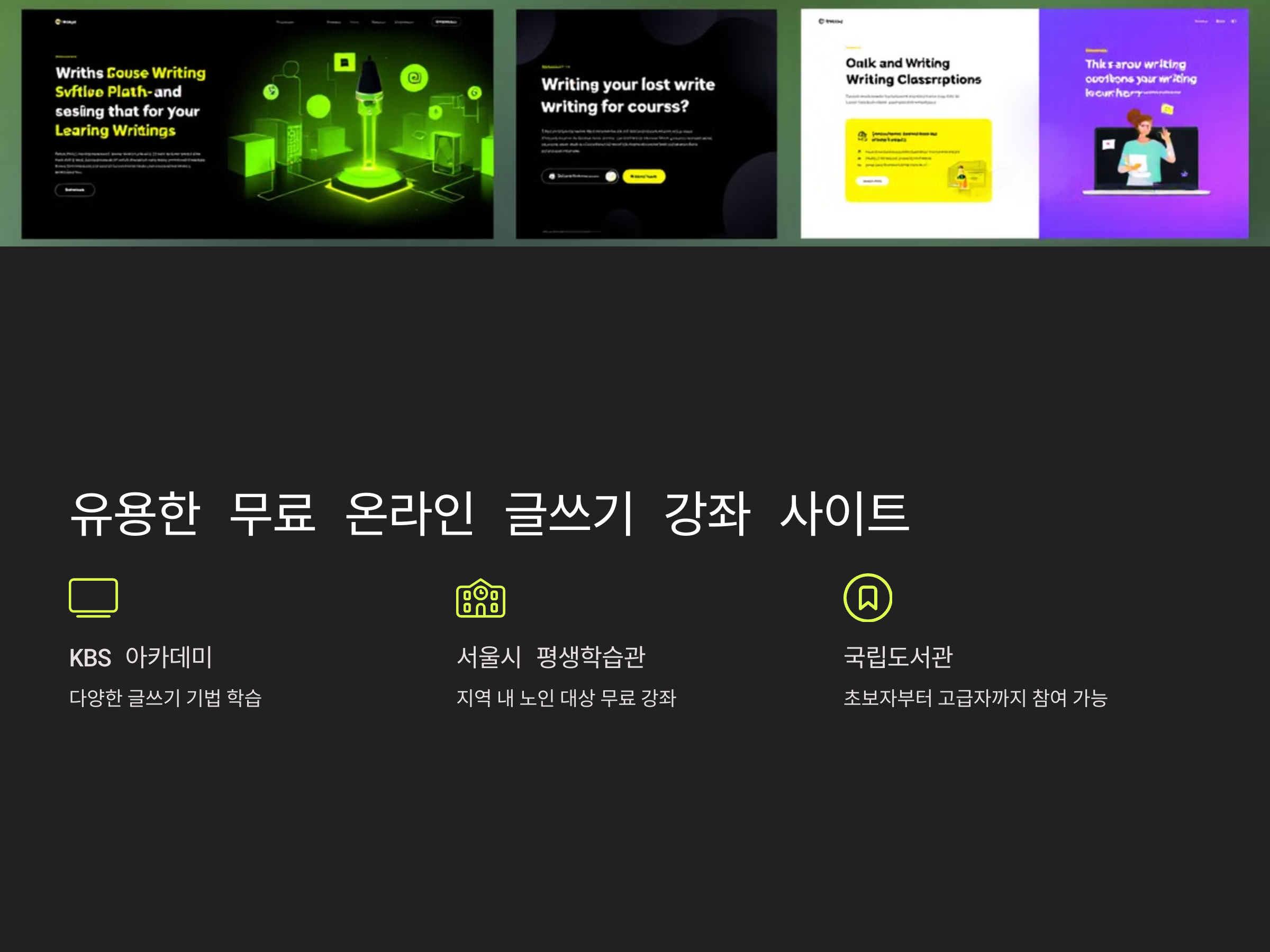 - KBS 아카데미: KBS에서는 노인들을 위한 무료 글쓰기 강좌를 제공하고 있으며, 이를 통해 다양한 글쓰기 기법을 배울 수 있습니다.