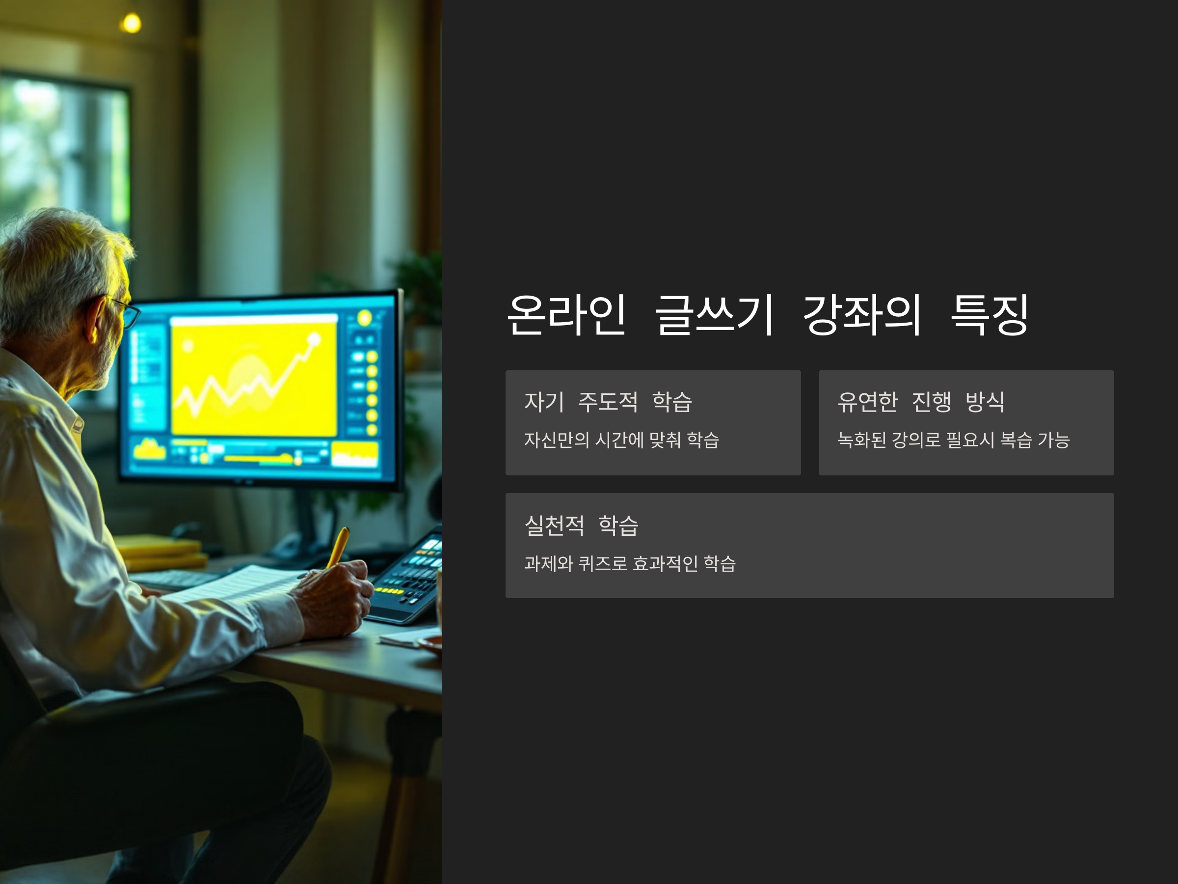 온라인 글쓰기 강좌는 노인분들에게 매우 유익한 경험을 제공합니다. 그 중에서도 중요한 특징은 바로 자기 주도적인 학습이 가능하다는 점입니다. 노인분들이 자주 언급하는 어려움 중 하나는, 정해진 시간에 맞추어 외출을 하거나 학원에 가는 것인데, 온라인 강좌는 이러한 문제를 해결할 수 있습니다. 집에서 편안하게 자신만의 시간에 맞춰 학습할 수 있기 때문입니다.