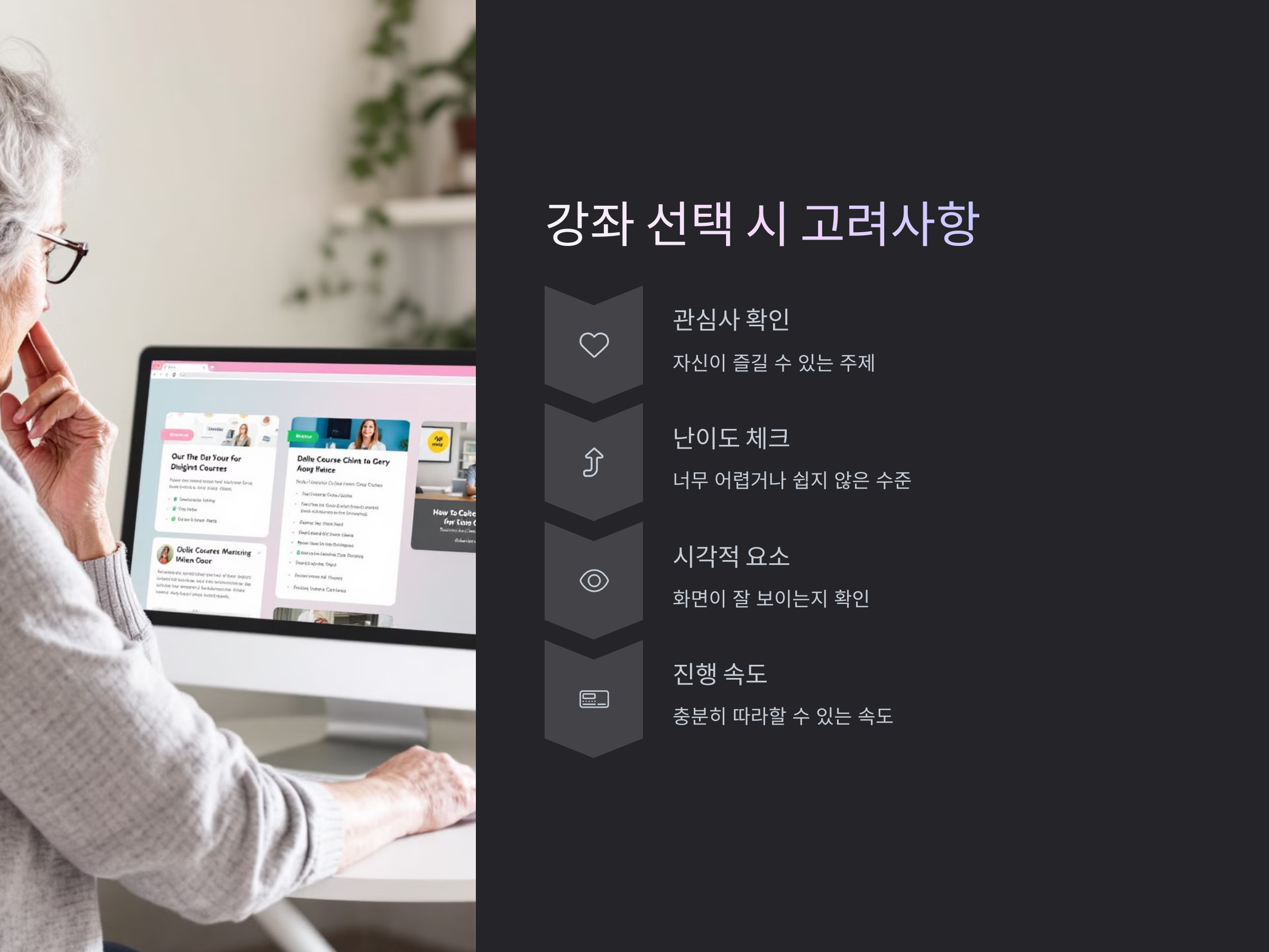 무료 온라인 강좌를 선택할 때는 자신의 관심사와 수준에 맞는 강좌를 고르는 것이 중요합니다. 강좌 내용이 너무 어려운 경우에는 흥미를 잃을 수 있으며, 너무 쉬운 강좌는 실력을 늘리는데 도움이 되지 않을 수 있습니다. 또한, 노인분들이 온라인 강좌를 들을 때는 시각적, 청각적 요구를 충족하는 강좌를 선택하는 것이 좋습니다. 화면이 너무 작거나, 설명이 빠르게 진행되면 학습에 어려움이 있을 수 있습니다.