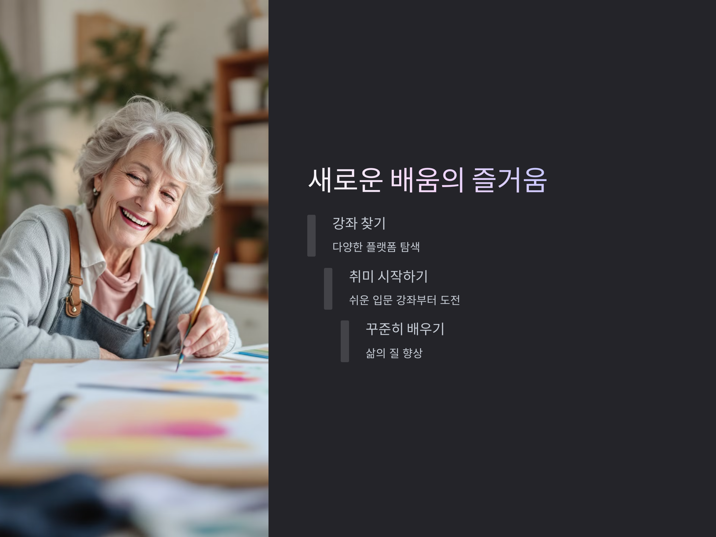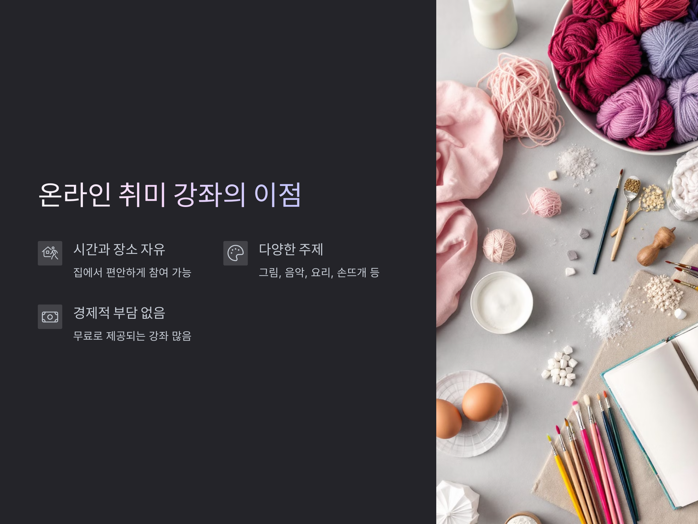 온라인 취미 강좌는 시간과 장소에 구애받지 않아 매우 유용합니다. 특히 집에서 편안하게 참여할 수 있어 이동이 불편한 노인들에게는 큰 장점이 될 수 있습니다. 더불어, 온라인 강좌는 다양한 주제와 형식으로 제공되기 때문에, 자신의 관심사에 맞는 강좌를 선택할 수 있습니다. 예를 들어, 그림 그리기, 음악 배우기, 요리, 손뜨개, 사진 촬영 등 다양한 취미를 학습할 수 있는 기회가 제공됩니다. 또한, 이러한 강좌는 많은 경우 무료로 제공되므로 경제적인 부담 없이 새로운 취미를 시작할 수 있는 좋은 기회를 제공합니다.