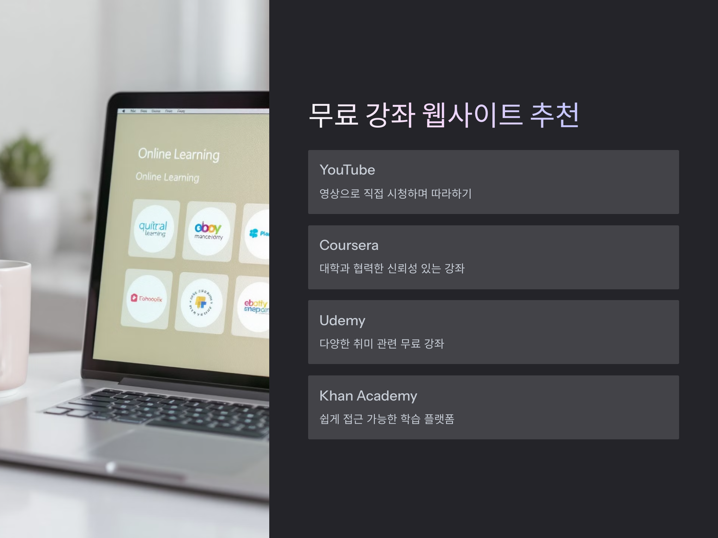 더 이상 주저하지 말고, 온라인에서 제공하는 다양한 무료 강좌에 도전하여 즐거운 취미 생활을 시작해보세요. 작은 변화가 큰 즐거움을 가져다 줄 것입니