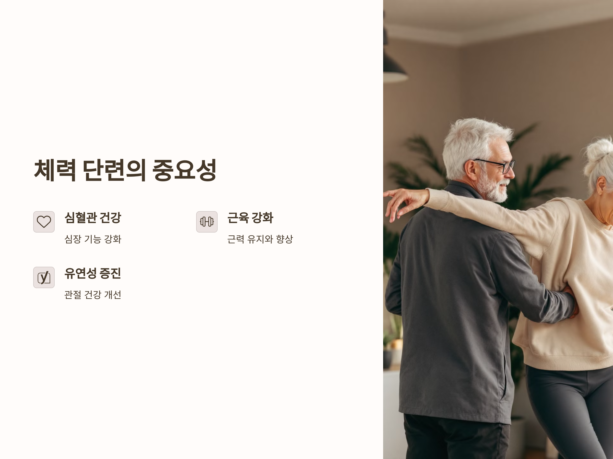 체력 단련은 나이가 들수록 더 중요해집니다. 심혈관 건강을 유지하고, 근육을 강화하며, 유연성을 높이는 데 도움을 줄 수 있는 운동은 노인의 생활에 큰 변화를 가져옵니다. 따라서, 체력 단련 프로그램을 통해 노인들이 적극적으로 운동에 참여하고 건강을 관리할 수 있도록 지원하는 것이 필요합니다. 또한, 무료로 제공되는 프로그램을 이용함으로써 경제적 부담 없이 운동을 할 수 있다는 장점도 있습니다.