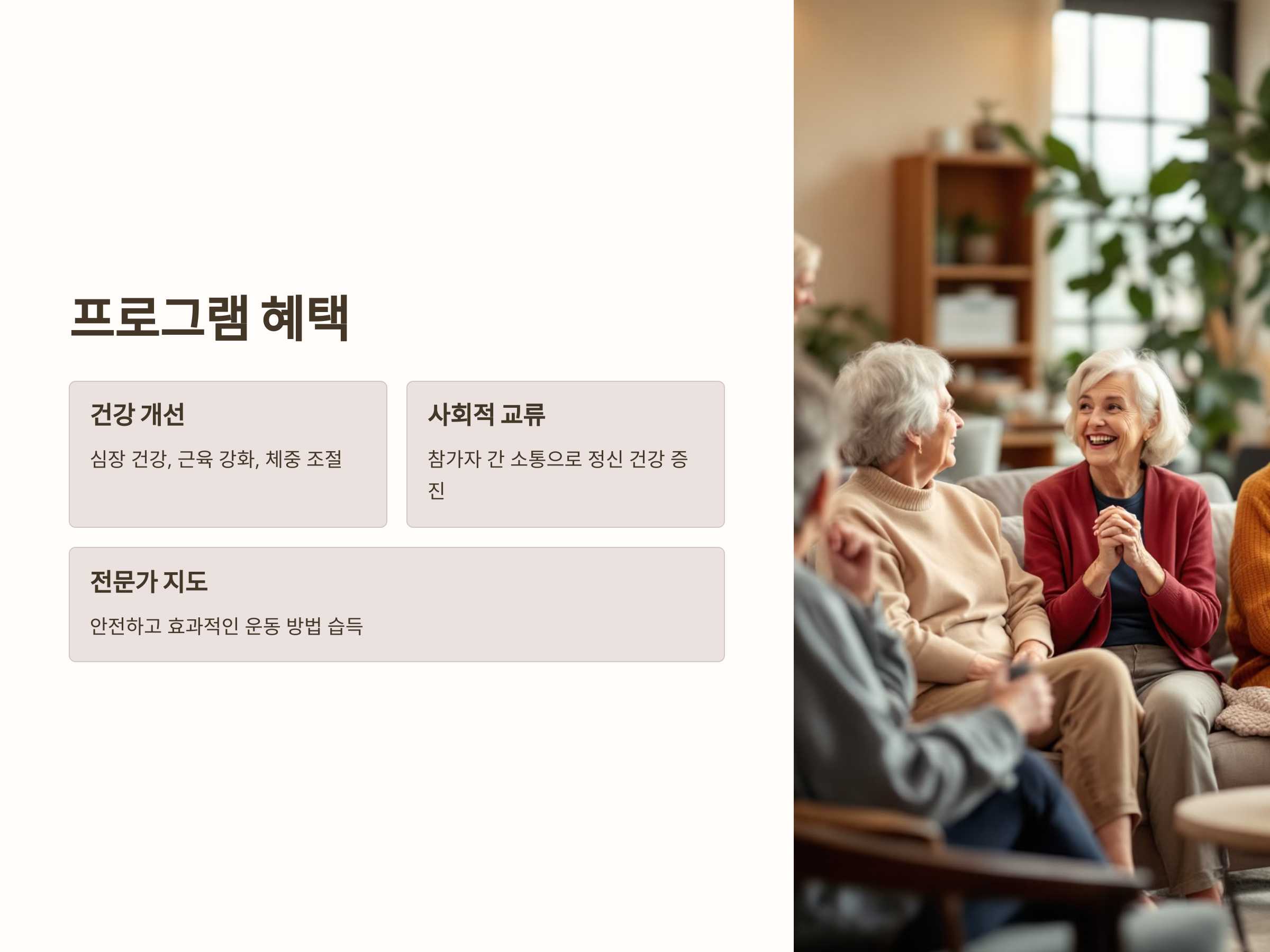 운동 프로그램에 참여하면 다른 참가자들과의 교류를 통해 사회적 활동을 늘릴 수 있습니다. 이는 정신 건강에도 큰 도움이 됩니다.