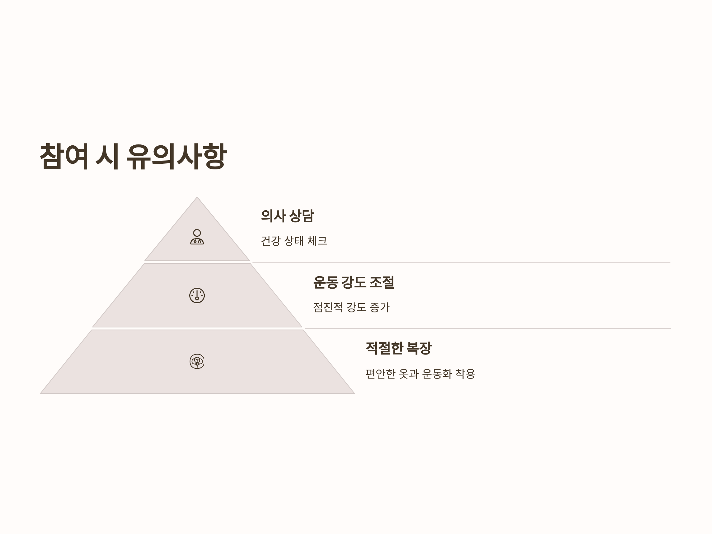 처음에는 과도한 운동을 피하고, 몸 상태에 맞춰 점진적으로 운동 강도를 높여가는 것이 좋습니다. 전문가의 지도 아래 운동 강도를 조절해야 부상의 위험을 줄일 수 있습니다.