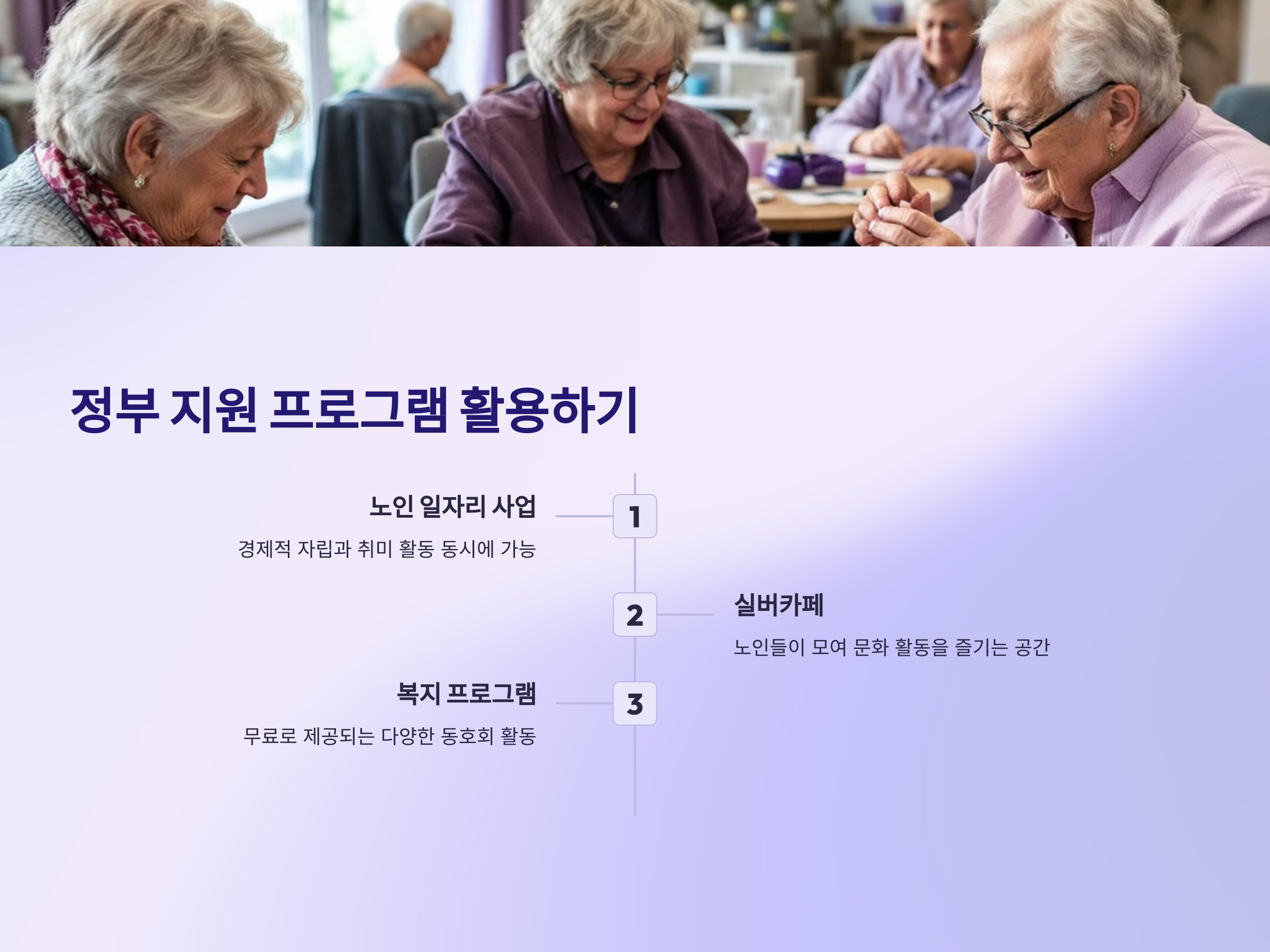 정부는 노인들을 위한 여러 지원 프로그램을 운영하고 있습니다. 이들 대부분은 무료로 제공되며, 다양한 동호회 활동을 포함하고 있습니다. 예를 들어, '노인 일자리 사업'은 경제적 자립을 돕기 위한 일자리뿐만 아니라, 취미 활동을 할 수 있는 프로그램도 제공하고 있습니다. 또한, '실버카페'와 같은 커뮤니티 센터에서는 노인들이 모여 문화 활동을 즐기거나, 취미를 나누는 다양한 프로그램을 제공합니다. 이와 같은 정부 지원 프로그램에 참여하면 무료로 활동을 즐기며 사회적 관계를 맺을 수 있습니다.
