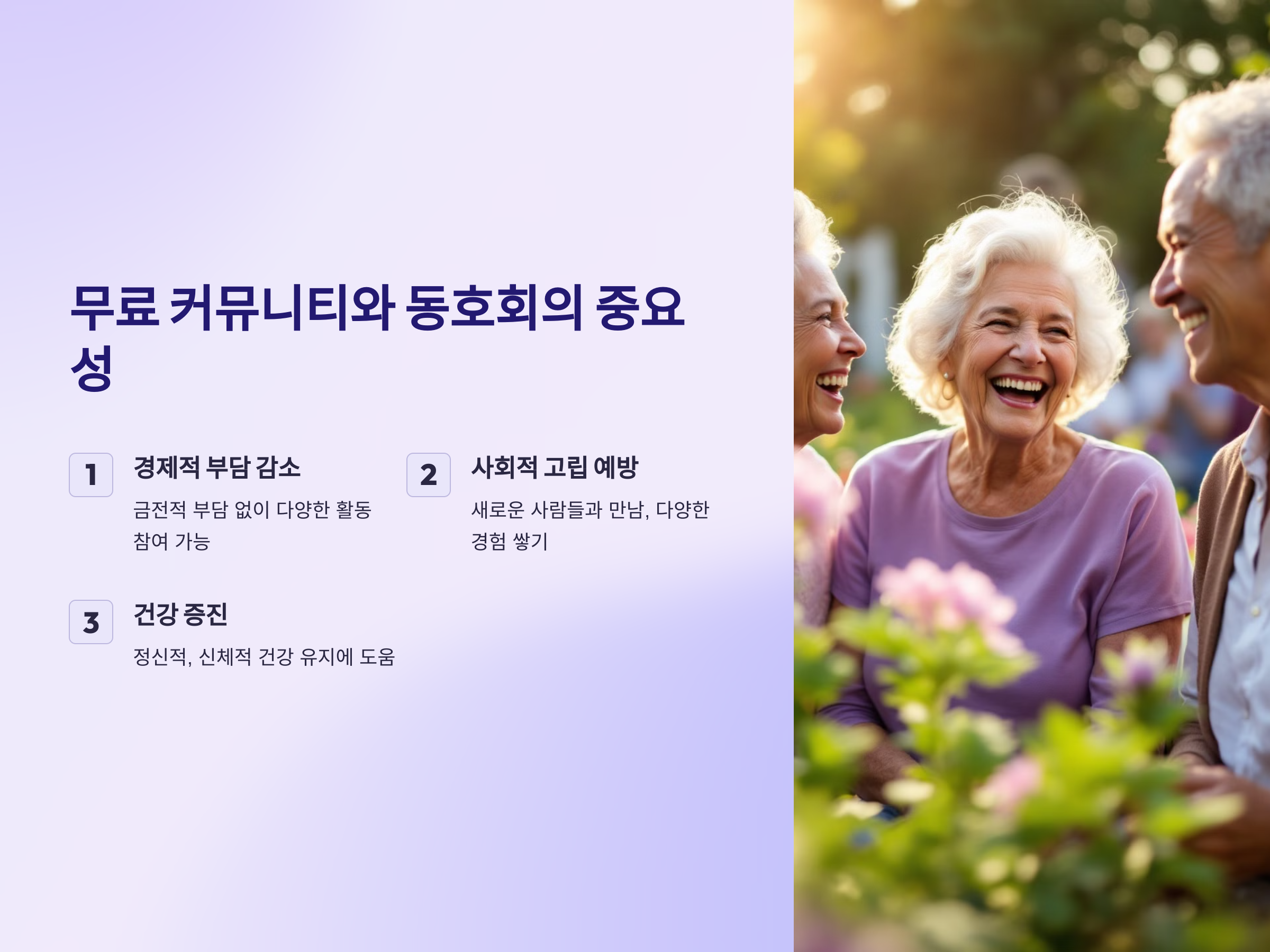 무료 커뮤니티와 동호회는 노인들에게 여러 가지 장점이 있습니다. 첫째, 경제적인 부담을 덜 수 있습니다. 많은 유료 동호회가 있지만, 금전적인 이유로 참여하지 못하는 노인들이 적지 않습니다. 무료 커뮤니티와 동호회는 경제적인 부담 없이 다양한 활동을 할 수 있는 기회를 제공합니다. 둘째, 사회적 고립을 예방할 수 있습니다. 나이가 들면서 사회적 관계가 줄어들기 쉬운데, 커뮤니티 활동은 새로운 사람들을 만나고, 다양한 경험을 쌓을 수 있는 기회를 제공합니다. 셋째, 정신적, 신체적 건강을 증진할 수 있습니다. 노인들이 활동적인 삶을 유지하려면, 지속적인 사회적 활동과 신체적 운동이 필요합니다. 무료 커뮤니티는 이러한 활동을 제공하는 중요한 공간이 될 수 있습니다.