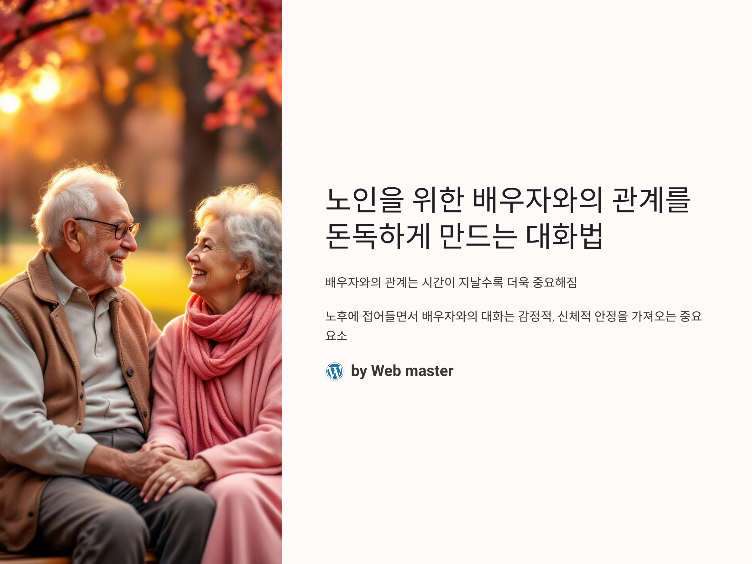 배우자와의 관계는 단순히 시간을 함께 보내는 것이 아니라, 서로의 감정을 이해하고 배려하는 소통을 통해 더욱 건강한 관계를 만들어 나가는 것입니다. 노후에 접어들면 신체적 변화나 심리적 변화로 인해 대화에서 더 많은 세심함과 주의가 필요합니다. 이를 통해 서로를 존중하고 배려하는 관계를 지속적으로 유지할 수 있습니다.