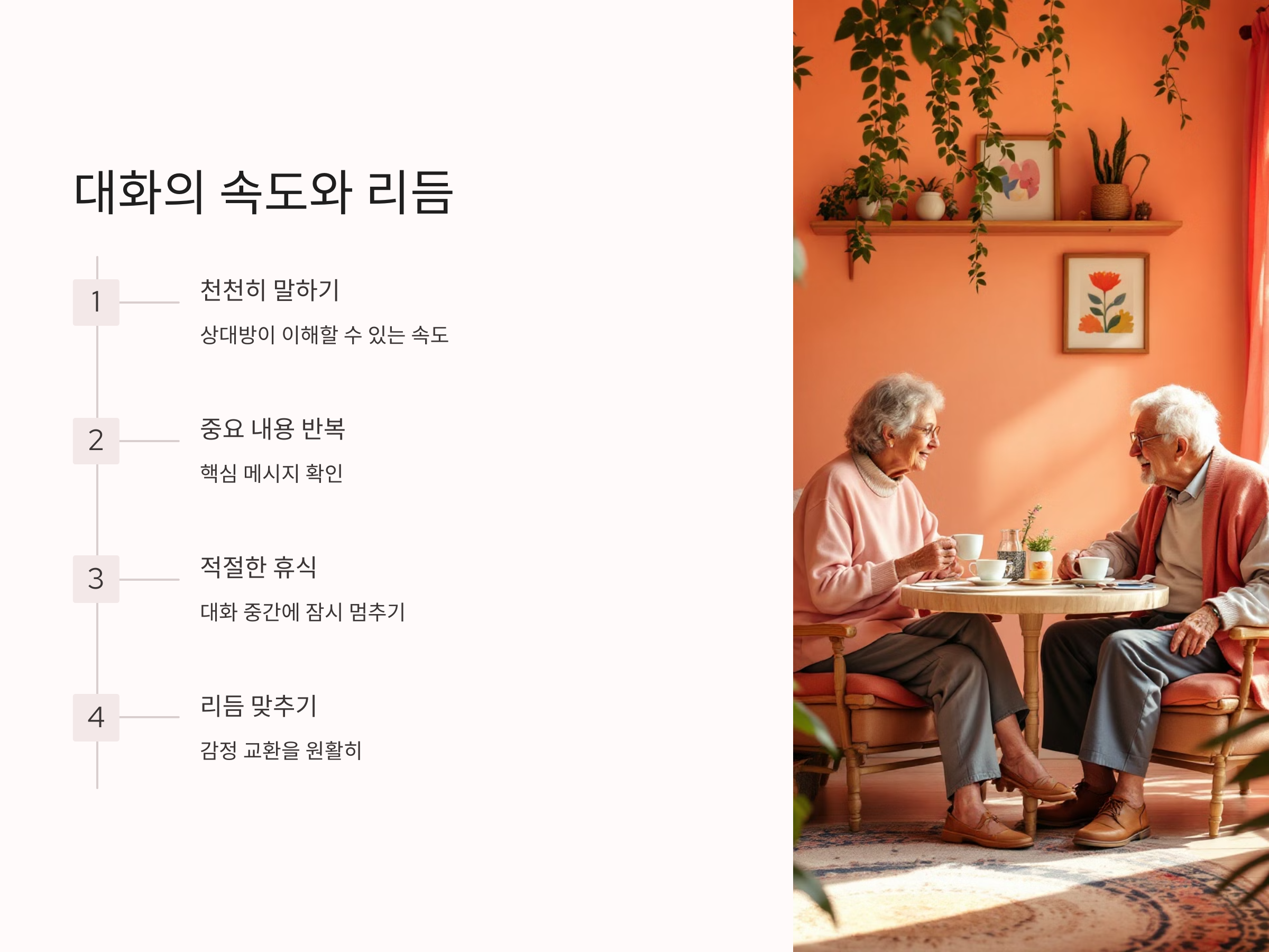 노후에는 대화 속도나 리듬도 중요한 요소가 될 수 있습니다. 나이가 들수록 대화의 속도가 빨라지거나 너무 느려지는 것을 피하는 것이 좋습니다. 너무 빠르게 대화를 이어가면 상대방이 놓치거나 이해하지 못하는 부분이 생길 수 있기 때문에, 천천히 말하면서 중요한 내용을 반복적으로 확인하는 것이 좋습니다.