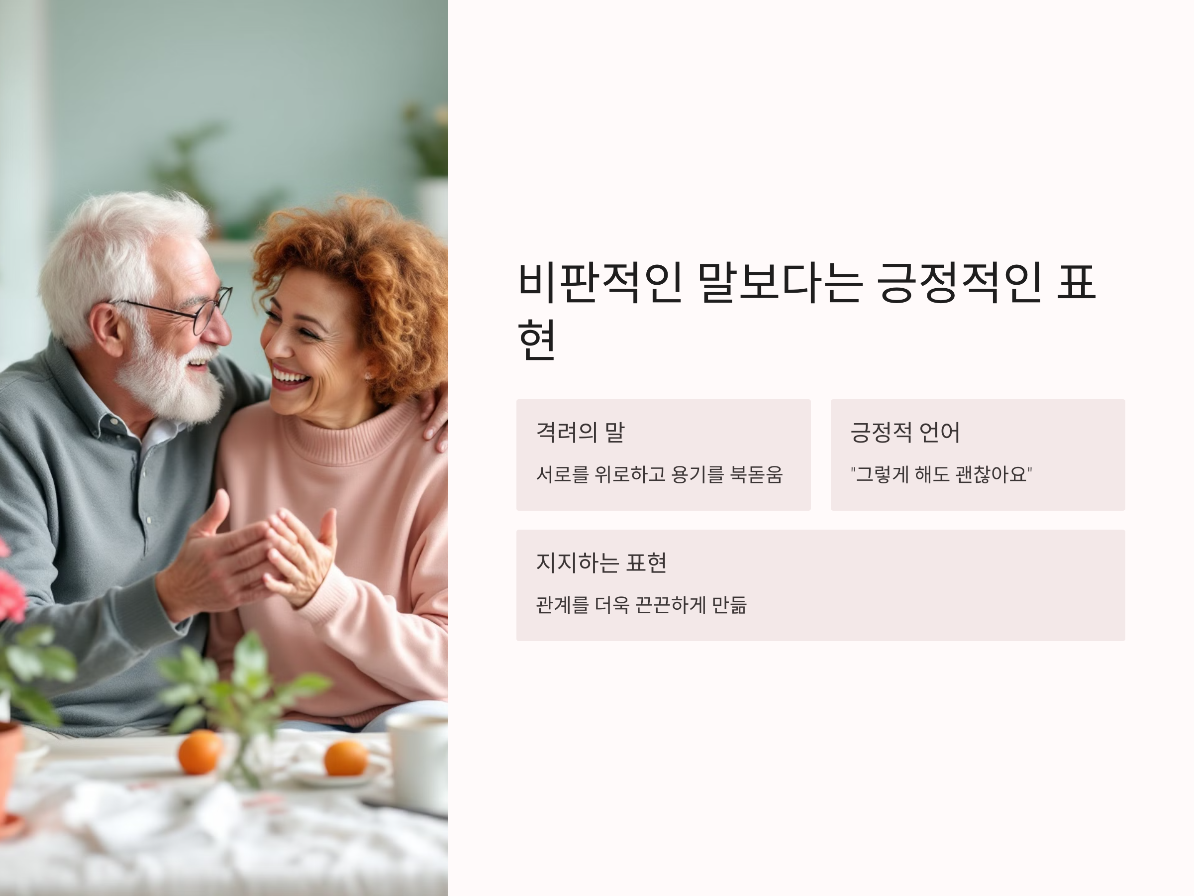 비판적인 말은 관계를 쉽게 어렵게 만들 수 있습니다. 특히 노후에는 감정이 예민해질 수 있기 때문에, 배우자에게 비판적인 말을 하는 것보다는 긍정적인 표현을 사용하는 것이 좋습니다. 예를 들어, "그렇게 해도 괜찮아요, 너무 걱정하지 말아요"와 같은 말은 상대방에게 편안함을 주고 긍정적인 분위기를 형성할 수 있습니다.