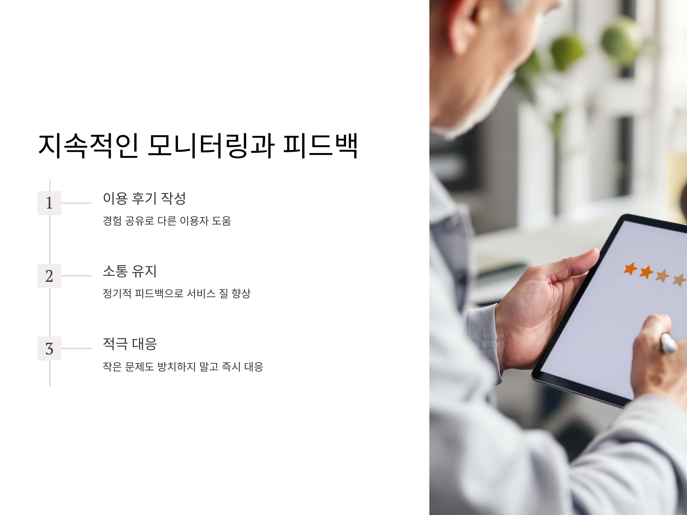 - 서비스 제공자와의 소통 유지: 정기적인 피드백을 통해 서비스의 질을 향상시키는 데 기여할 수 있습니다.