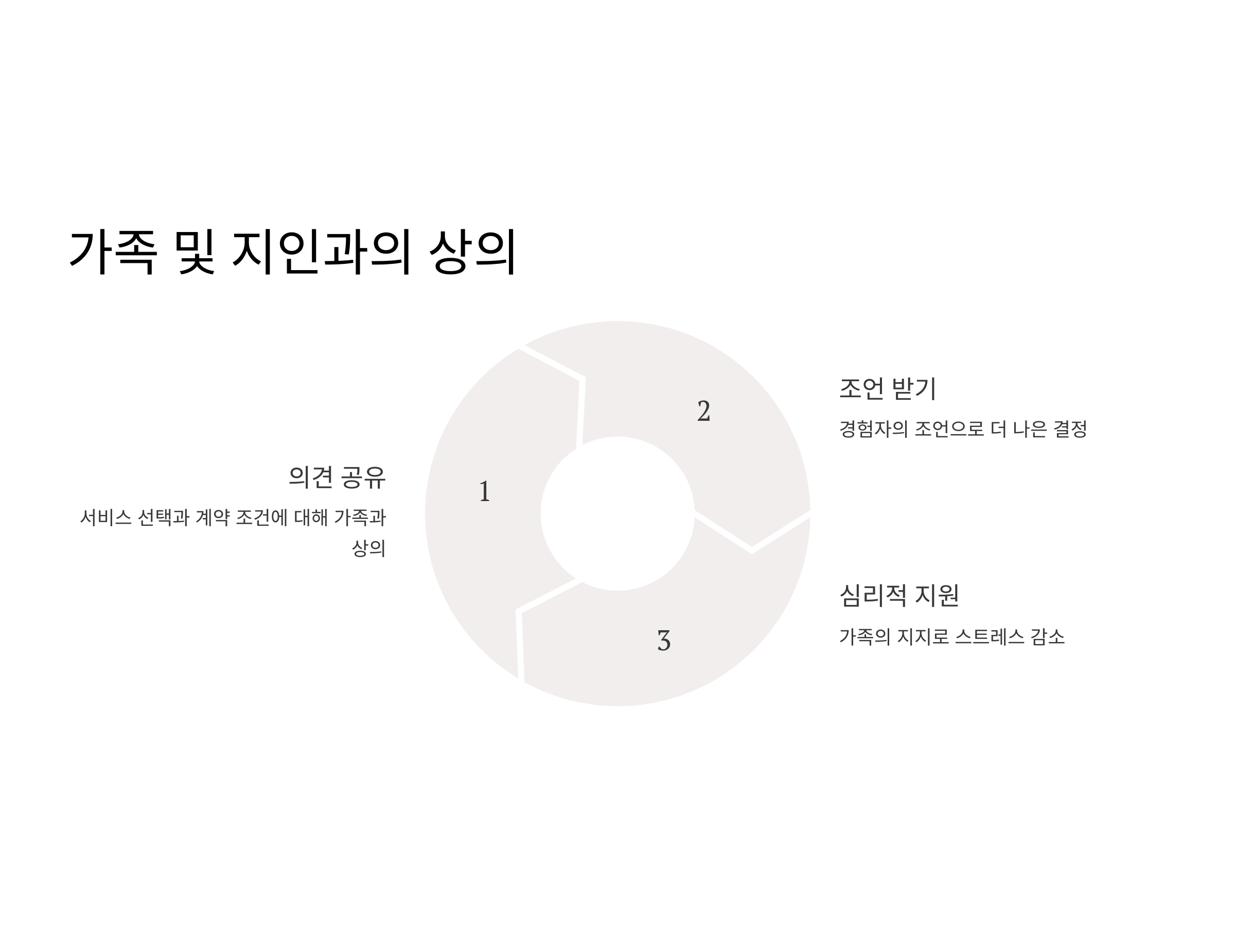 - 의견 공유: 서비스 선택이나 계약 조건 등에 대해 가족이나 가까운 지인과 의견을 나누어 보세요.