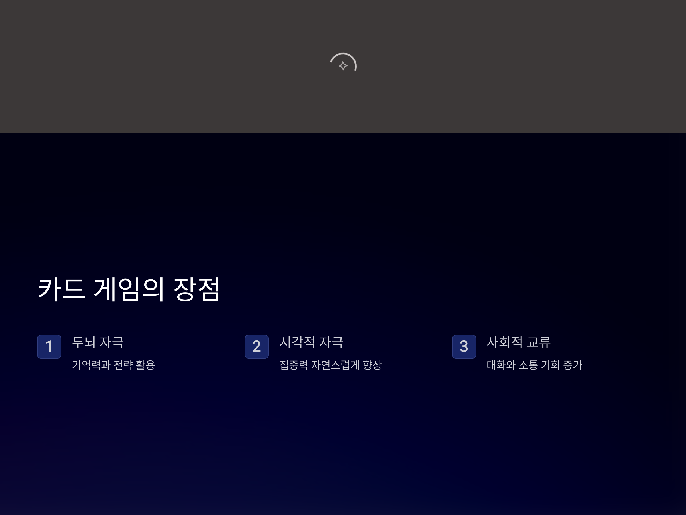 카드 게임은 단순히 여가를 즐기는 방법을 넘어서, 뇌 건강과 집중력을 향상시키는 데 매우 유익한 도구가 될 수 있습니다. 노인분들이 게임을 통해 뇌를 자극하고 기억력, 반응 속도, 스트레스 감소 등을 경험할 수 있는 기회를 제공합니다. 게임은 재미를 넘어서 두뇌를 활발하게 만들며, 사회적 상호작용을 증진시키는 데도 좋은 방법입니다.