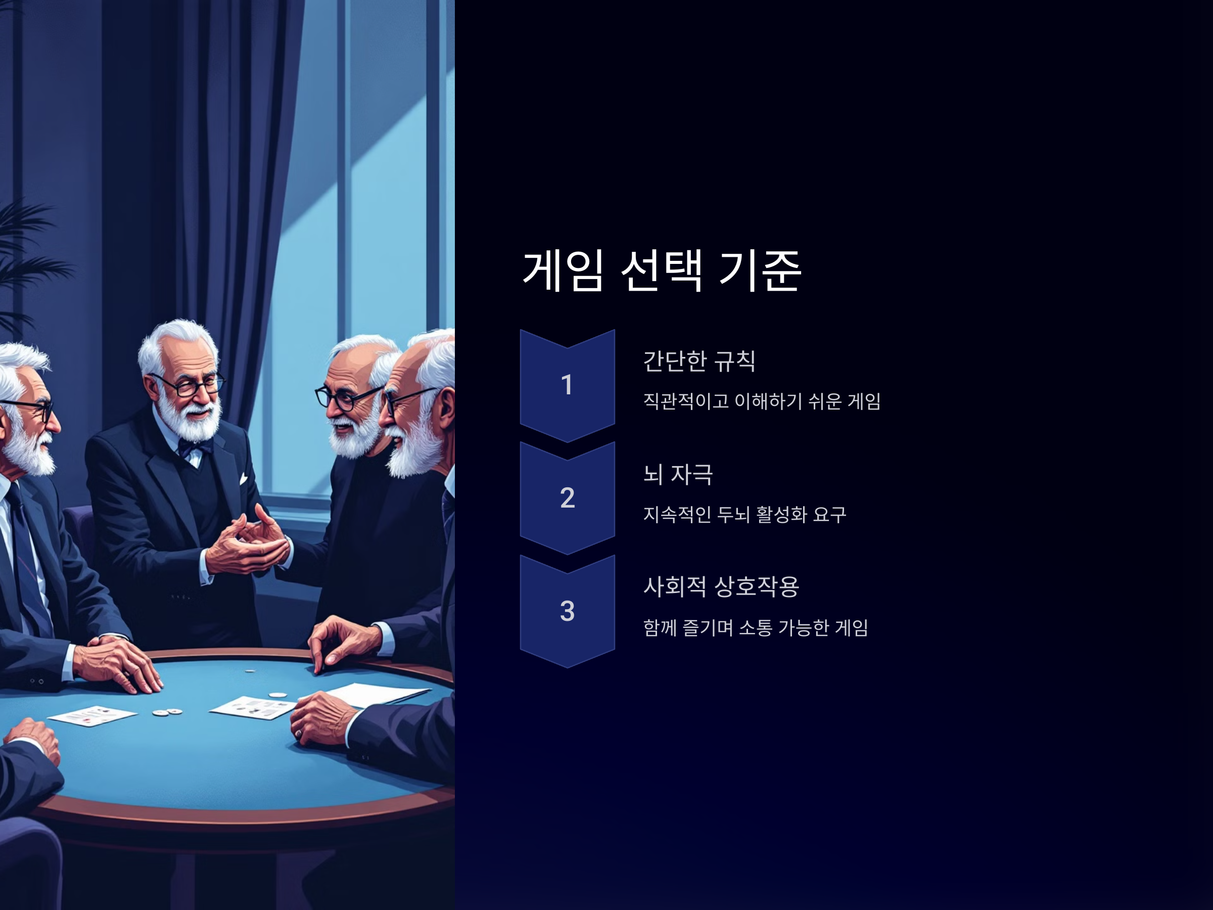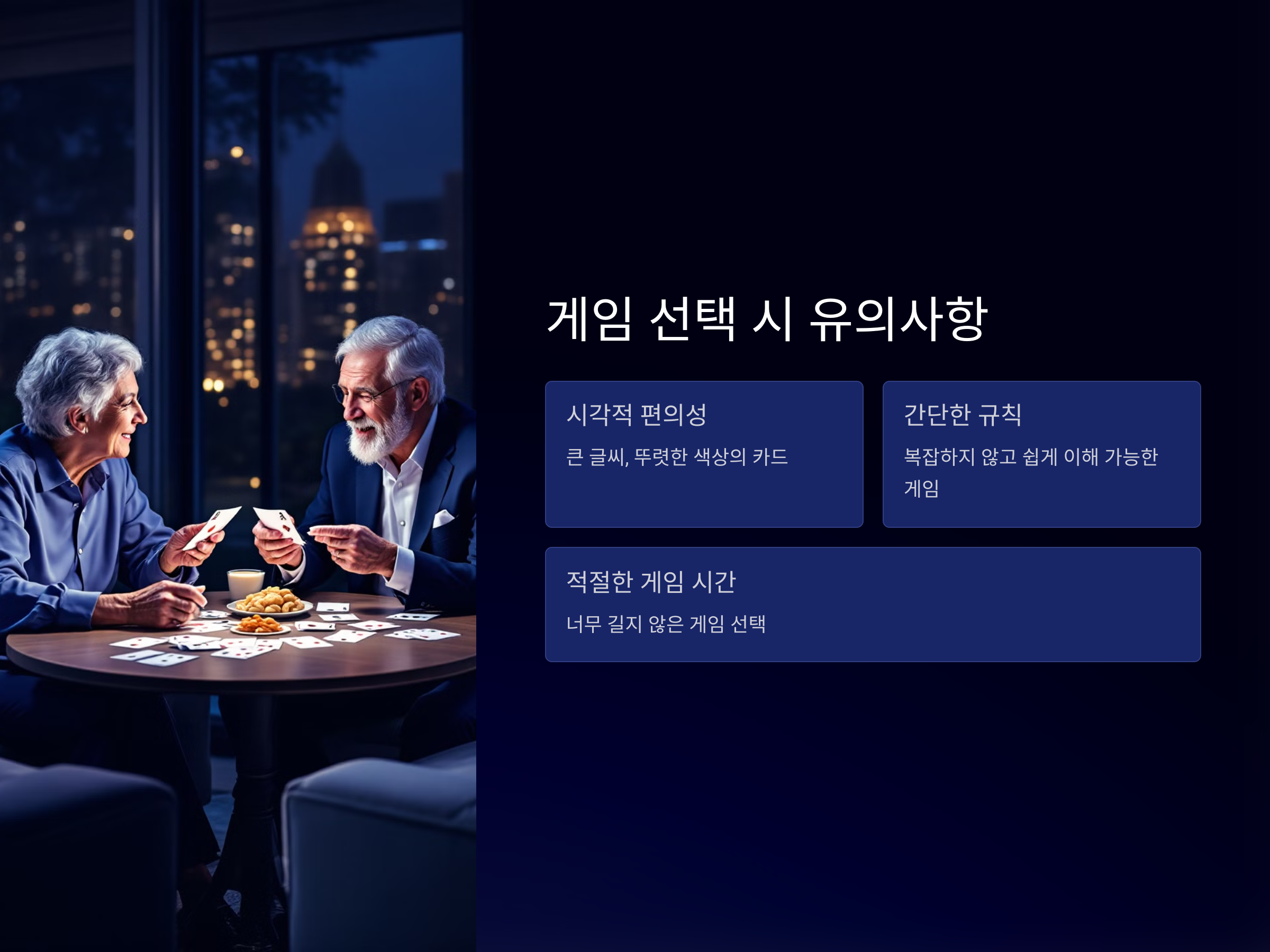 게임을 시작하는 데 어려움이 없어야 하며, 규칙이 직관적일수록 좋습니다. 게임의 룰을 쉽게 이해할 수 있는 게임이 노인에게 적합합니다. 또한, 게임을 진행하면서 스트레스를 받지 않도록 적절한 난이도가 중요합니다.