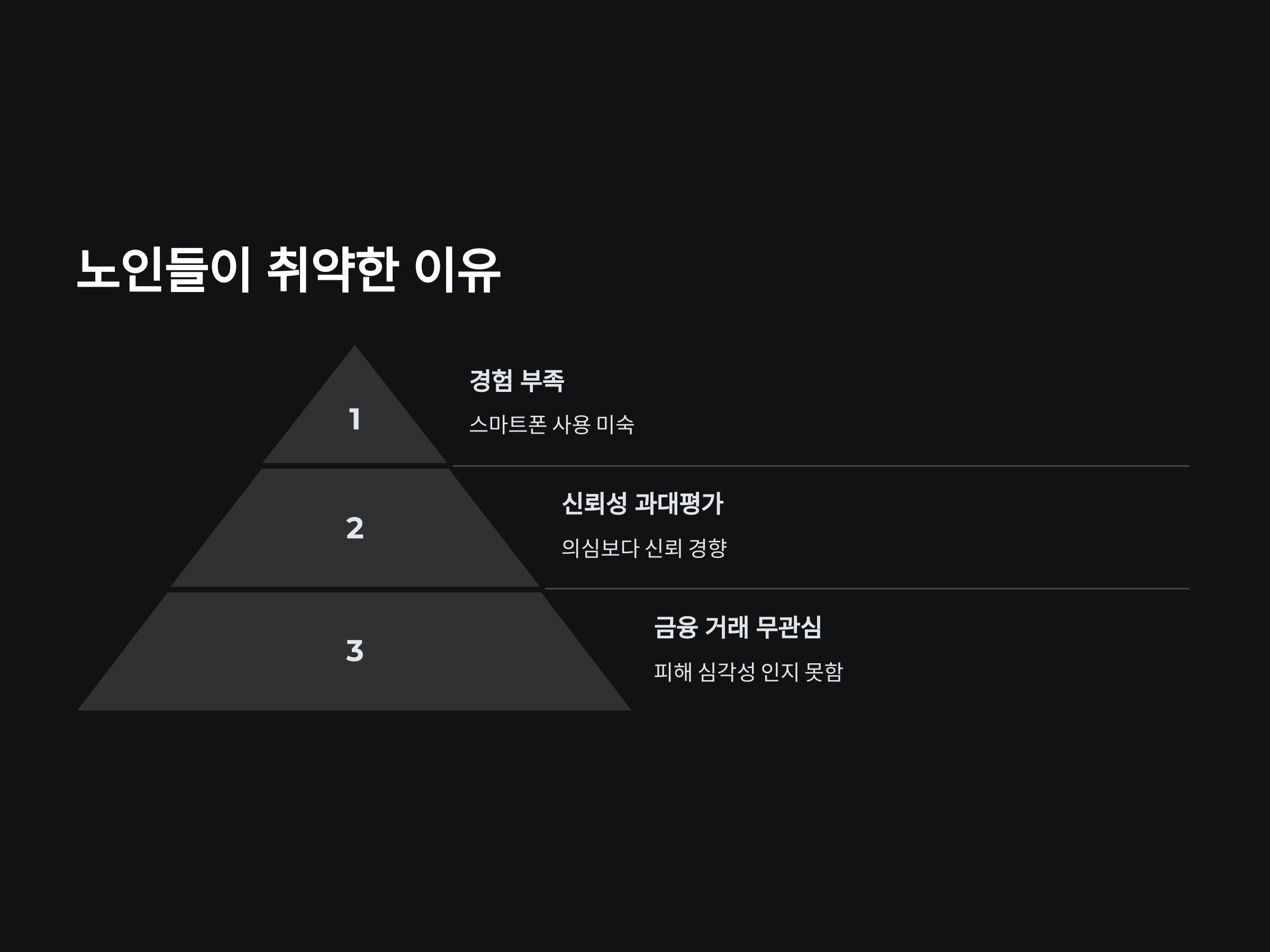 또한, 많은 노인들이 금융 거래에 있어 직접적인 관심을 두지 않기 때문에, 만약 피싱 사이트에 들어가 개인 정보를 입력하거나 불법적인 요청을 받더라도 심각성을 인지하지 못하는 경우가 많습니다. 이로 인해 금전적 피해가 발생할 수 있습니다.