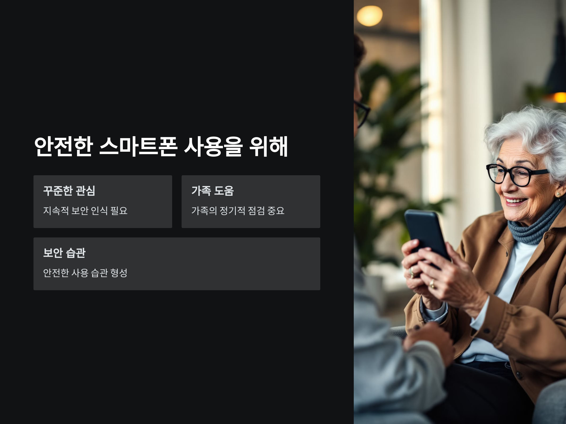 노인들이 스미싱에 대한 경각심을 가지기 위해서는 가족들의 도움이 매우 중요합니다. 자주 연락을 주고받는 가족이나 지인들과 함께 스미싱 예방 교육을 주기적으로 하는 것이 좋습니다. 이를 통해 노인들은 스미싱 사기를 쉽게 구별할 수 있고, 만약 의심스러운 문자를 받았을 때 어떻게 대처해야 할지에 대해 이해할 수 있습니다.