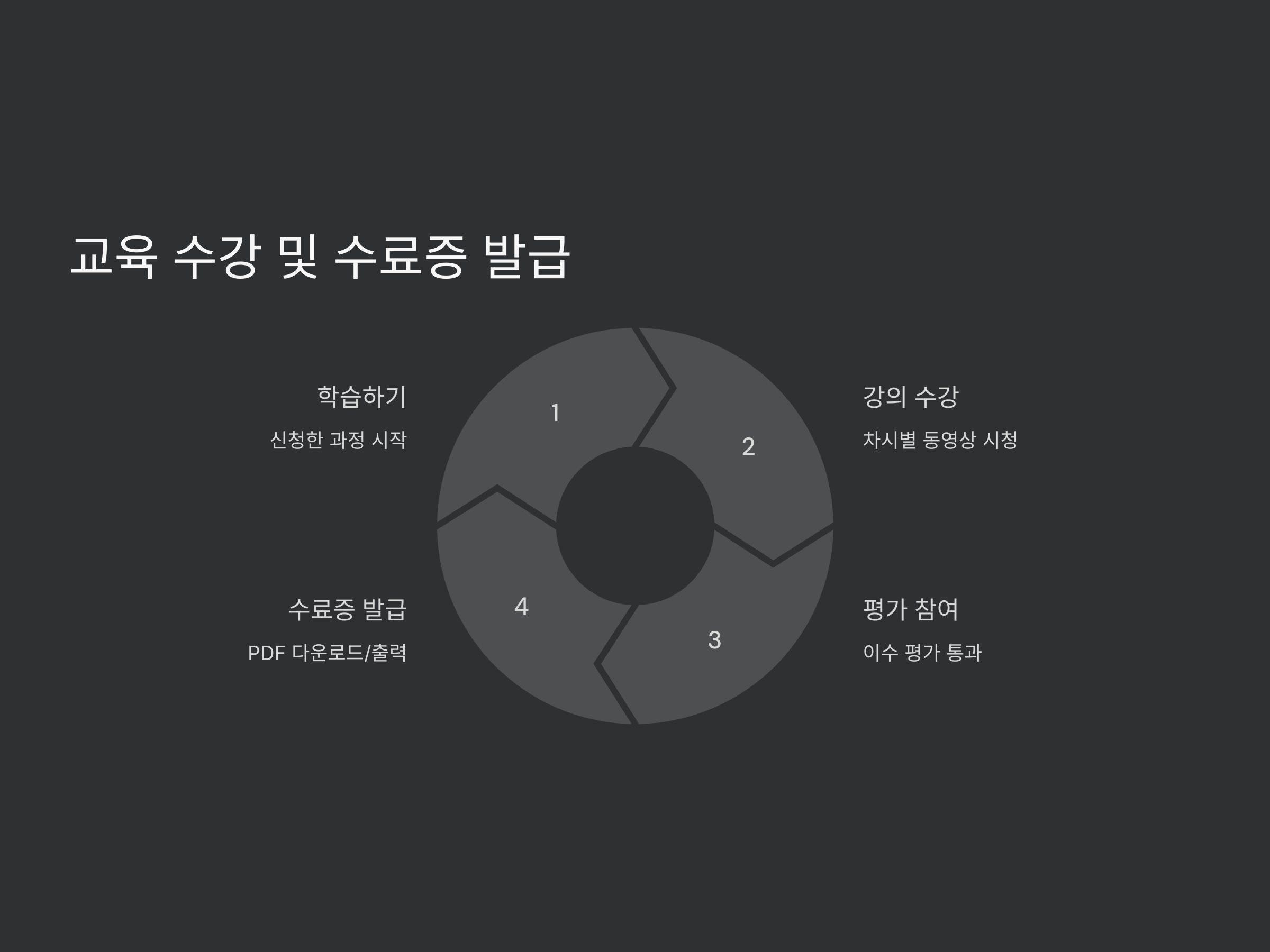- 수료증 발급: 평가를 통과하면, [학습하기/수료증] 메뉴에서 수료증을 PDF 형식으로 다운로드하거나 출력할 수 있습니다.