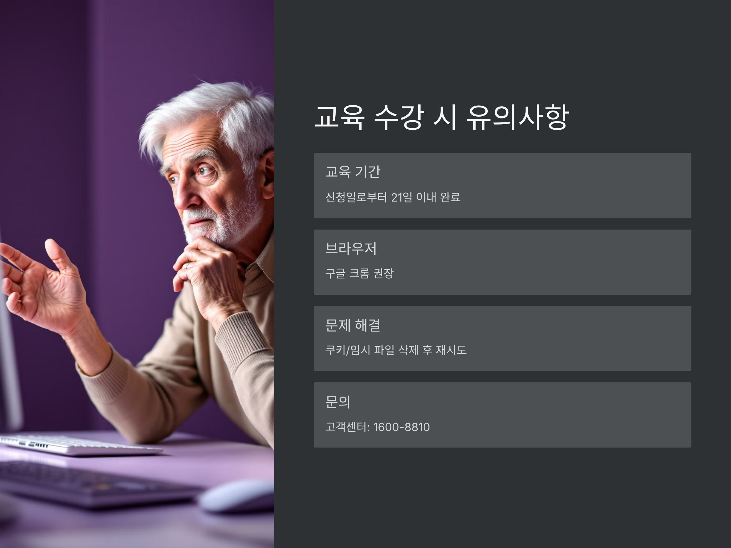 - 교육 기간: 수강신청일로부터 21일 이내에 교육을 완료해야 합니다.