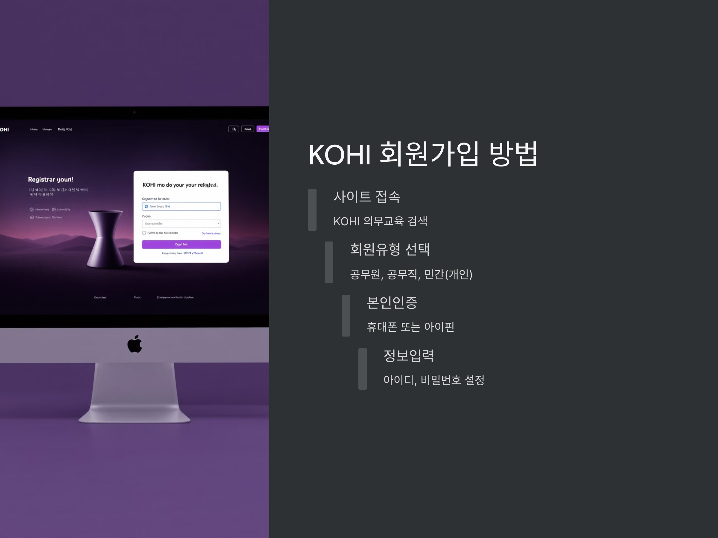 KOHI 의무교육을 수강하기 위해서는 먼저 회원가입이 필요합니다. 아래는 회원가입 절차입니다: