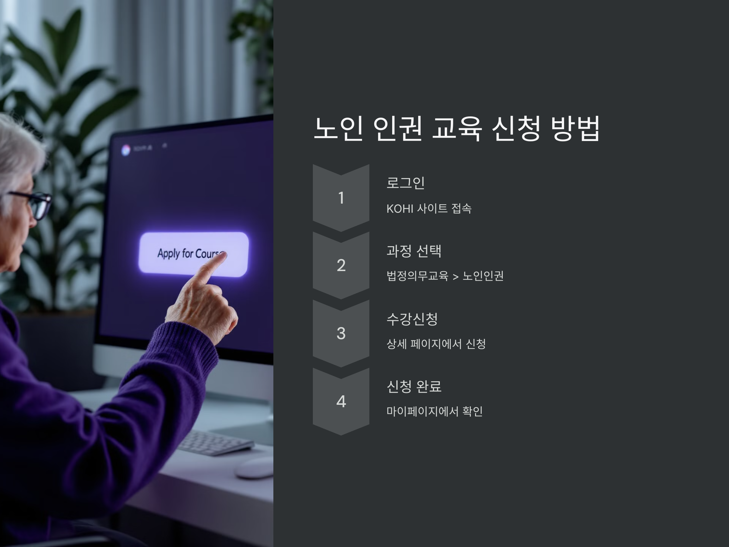 회원가입 및 로그인을 완료한 후, 노인 인권 교육을 신청하는 방법은 다음과 같습니다: