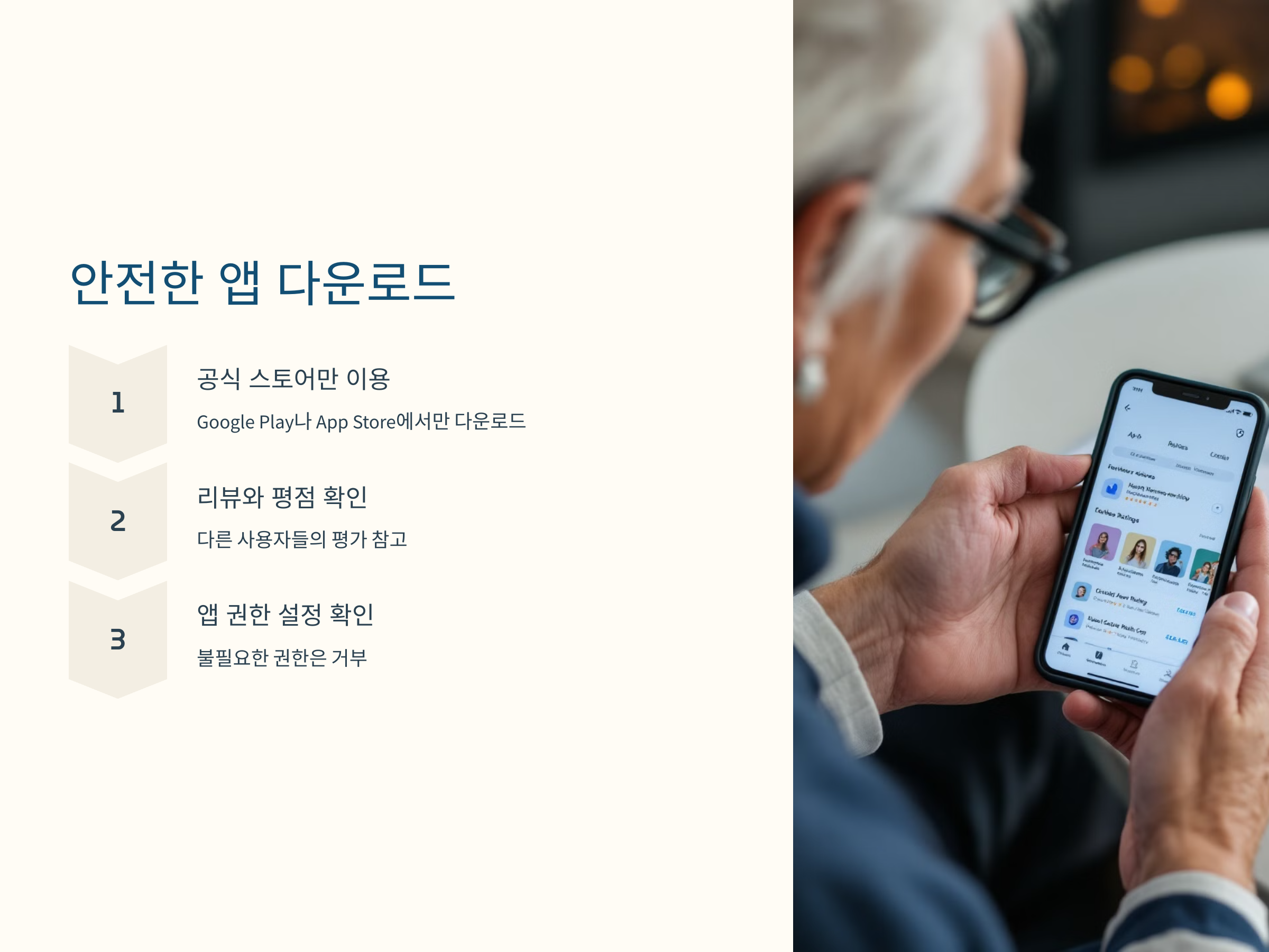 - 공식 스토어 사용: 앱을 다운로드할 때는 반드시 Google Play(안드로이드)나 Apple App Store(iOS)와 같은 공식 마켓에서만 다운로드합니다. 이곳에서는 보안이 검증된 앱만 제공되므로, 불필요한 위험을 피할 수 있습니다.