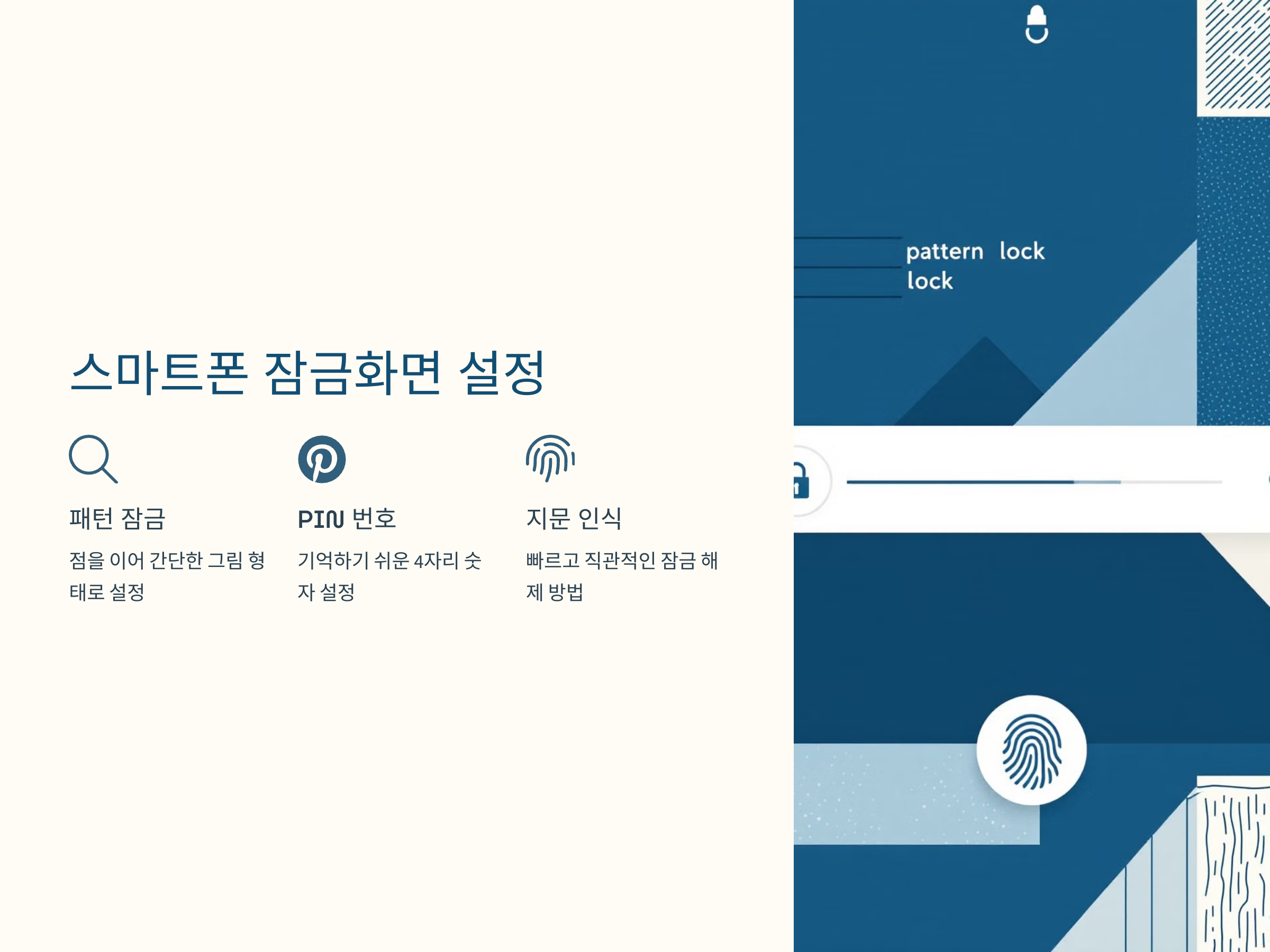 - 패턴 잠금: 간단한 형태로, 네 개의 점을 이어서 그림을 그리듯 설정하는 방식입니다. 패턴은 너무 복잡하지 않도록 설정하는 것이 중요합니다. 너무 복잡하면 기억하기 어려울 수 있기 때문입니다.