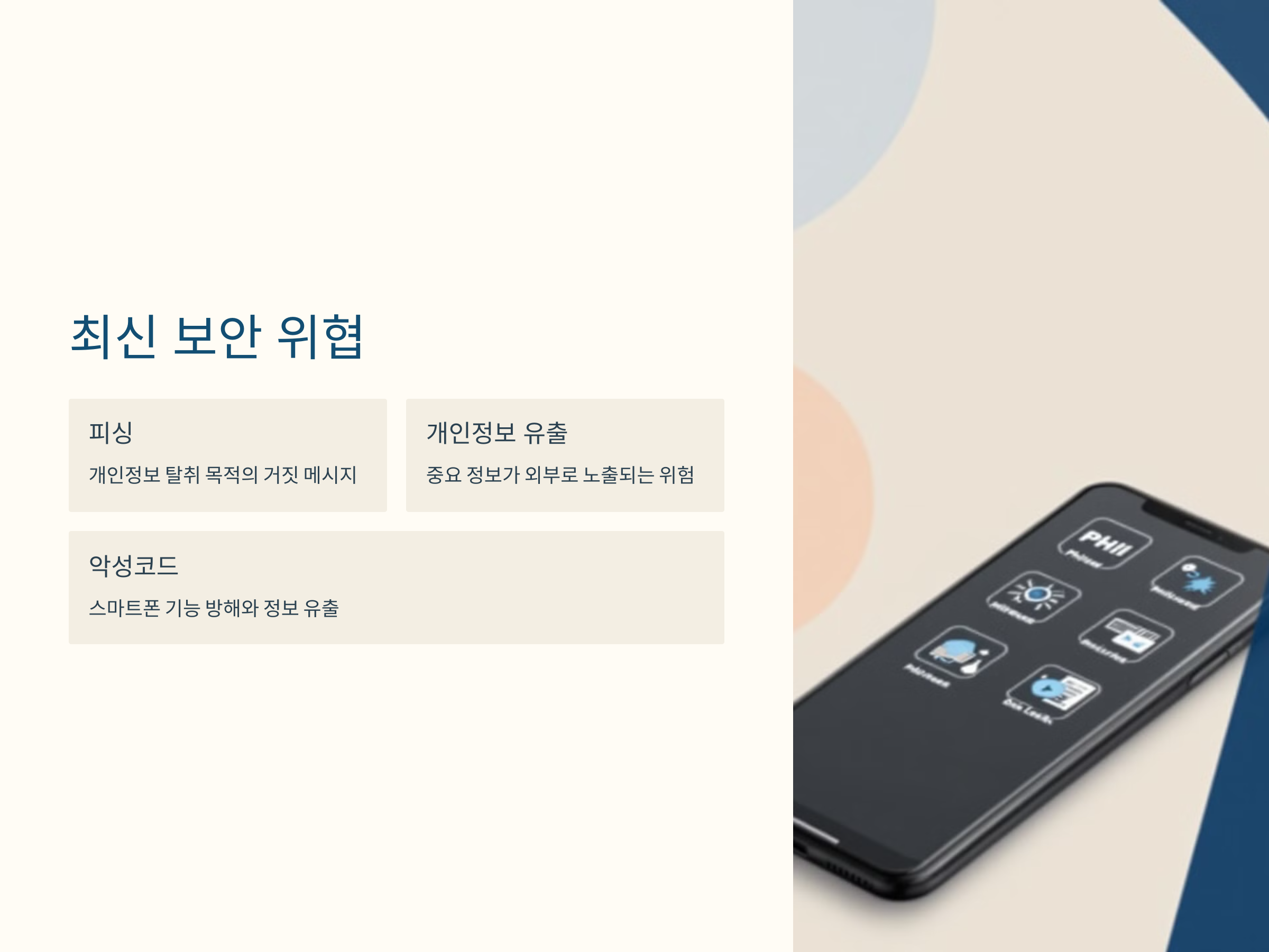 최근 스마트폰을 대상으로 한 보안 위협은 날로 증가하고 있습니다. 피싱, 개인정보 유출, 악성코드 및 해킹 등이 주요한 위협 요소로 떠오르고 있습니다. 특히 노인분들은 기술적인 변화에 익숙하지 않아서 이러한 위협에 더 취약한 경우가 많습니다. 예를 들어, 피싱 메시지나 악성 앱을 잘못 다운로드해 피해를 입는 일이 발생할 수 있습니다. 이러한 문제를 해결하기 위해서는 스마트폰의 보안을 강화하고, 보안 설정을 최적화하는 것이 가장 중요한 첫걸음입니다.