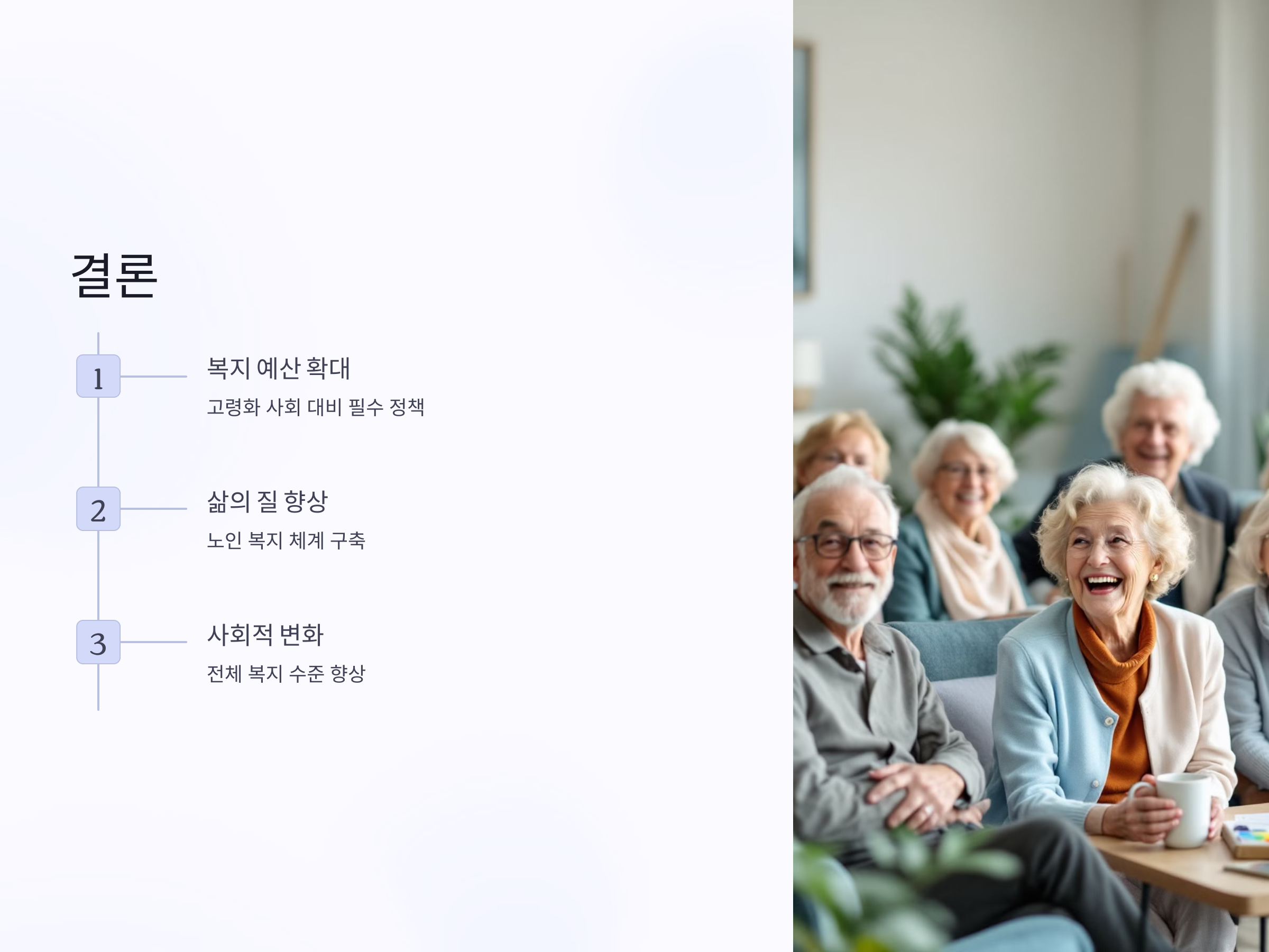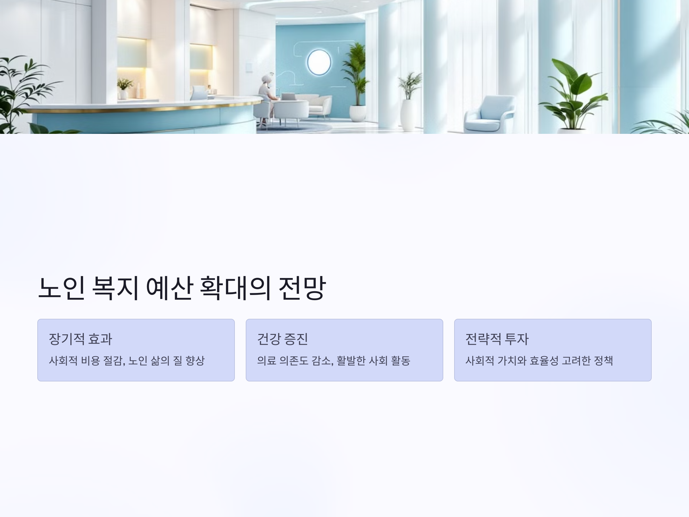 노인 복지 예산 확대는 단순한 예산 지출이 아니라, 고령화 사회에서 발생할 수 있는 여러 문제를 해결할 수 있는 중요한 해결책입니다. 고령화 사회에 맞춘 정책적 대응을 통해 노인의 삶을 더 나아지게 하고, 궁극적으로는 사회 전체의 복지 수준을 높이는 중요한 투자로 작용할 것입니다.