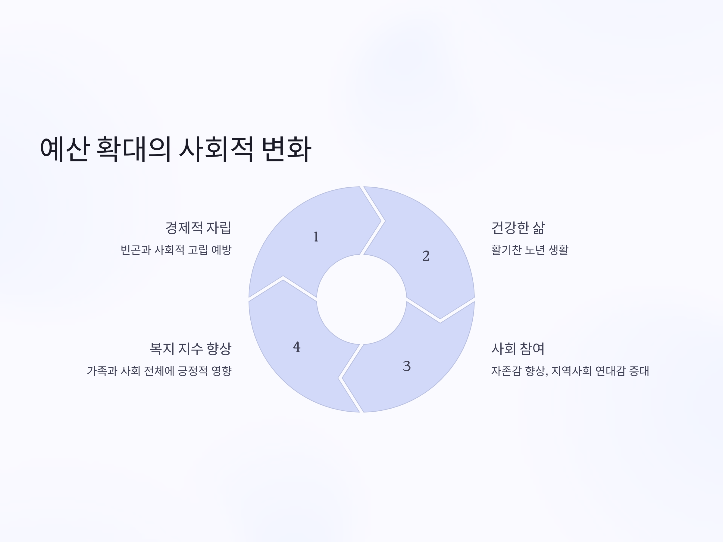 노인 복지 예산의 확대는 단순히 경제적 지원을 넘어서, 사회적 변화와 긍정적인 결과를 가져올 수 있습니다. 첫째, 노인들이 경제적으로 자립할 수 있는 기회를 제공함으로써, 빈곤과 사회적 고립을 예방할 수 있습니다. 둘째, 노인들이 더욱 활기차고 건강한 삶을 살아가게 되면, 사회적으로도 긍정적인 영향을 미칠 것입니다. 특히, 노인의 사회적 참여와 일자리 제공은 그들의 자존감을 높이고, 지역사회와의 연대감을 증대시킬 수 있습니다.
