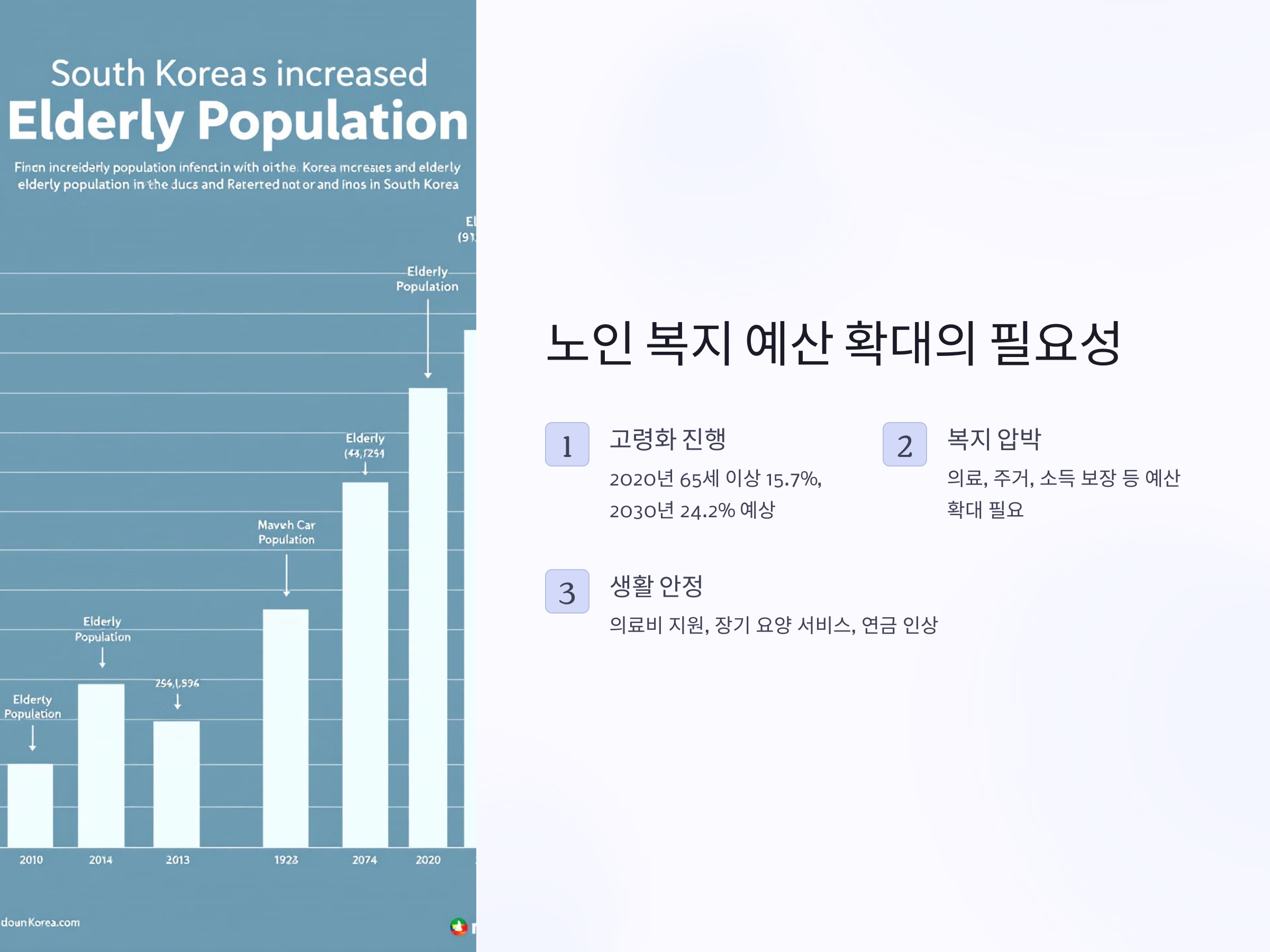 따라서 정부는 이러한 상황에 맞춰 복지 예산을 적절히 확대하고, 노인의 생활 안정을 보장하는 동시에 더 나은 복지 서비스를 제공할 필요가 있습니다. 예를 들어, 의료비 지원, 장기 요양 서비스, 연금 인상 등이 포함될 수 있습니다.