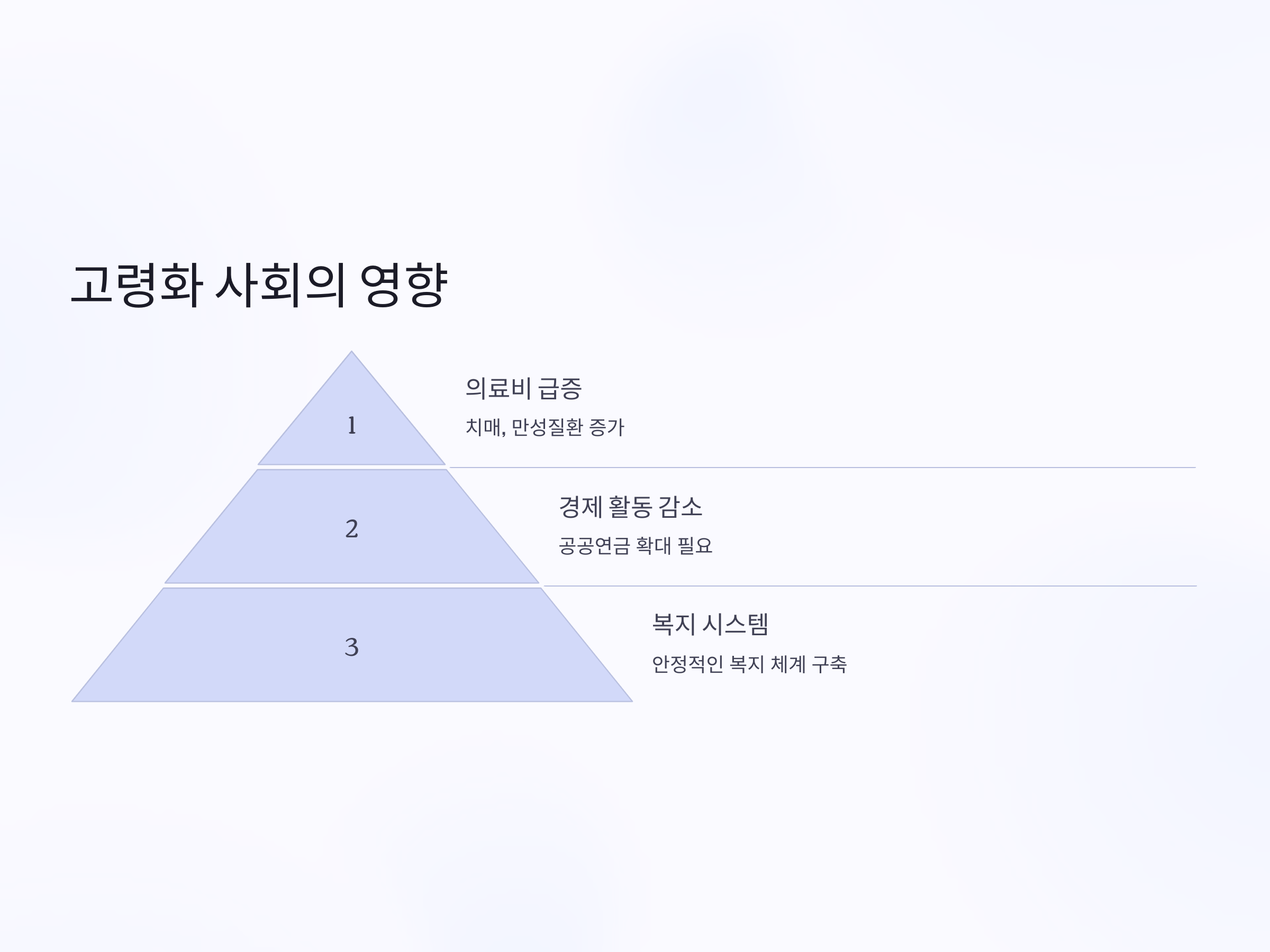 고령화가 진행될수록 노인의 건강 문제와 관련된 비용이 급증하고 있습니다. 특히 치매나 만성질환을 가진 노인들이 늘어나는 가운데, 이에 대한 의료비 부담을 줄여주는 것이 가장 중요한 과제입니다. 또한, 경제 활동을 하지 못하는 노인들이 많아지기 때문에 기본적인 생활을 유지하기 위해서는 공공연금의 확대와 안정적인 복지 시스템이 필수적입니다.