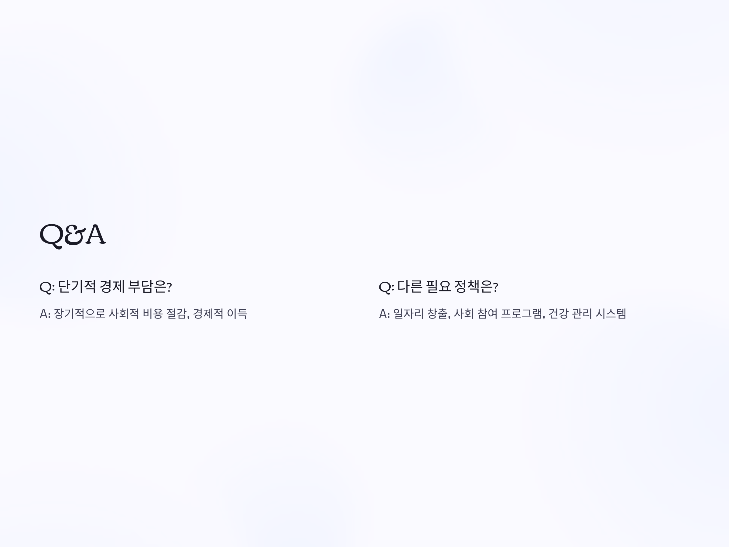 A1: 단기적으로는 경제적 부담이 있을 수 있지만, 장기적으로는 노인의 삶의 질 향상과 사회적 고립 예방, 의료비 절감 등 긍정적인 효과를 기대할 수 있습니다. 이는 결국 사회적 비용을 줄이고, 경제적으로도 이득을 가져올 수 있습니다.