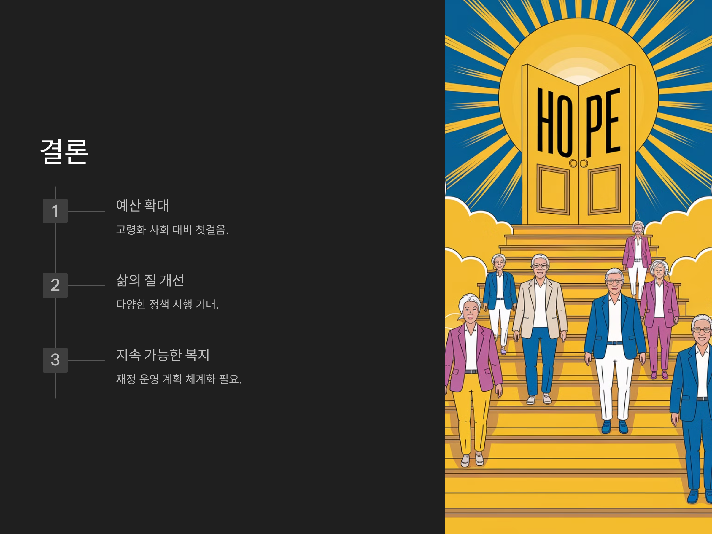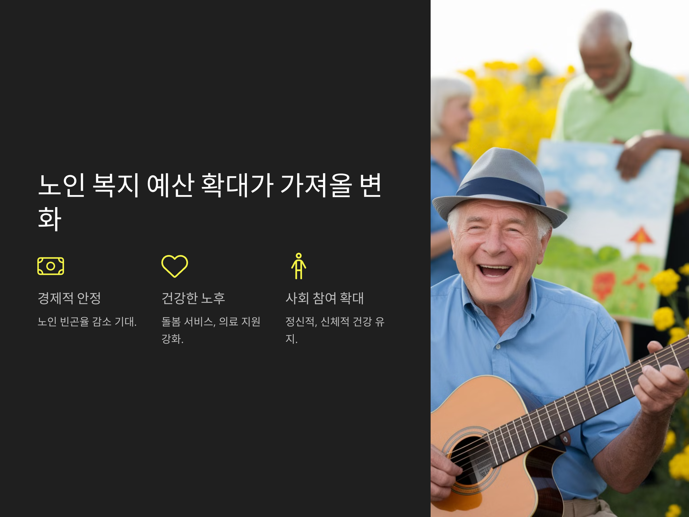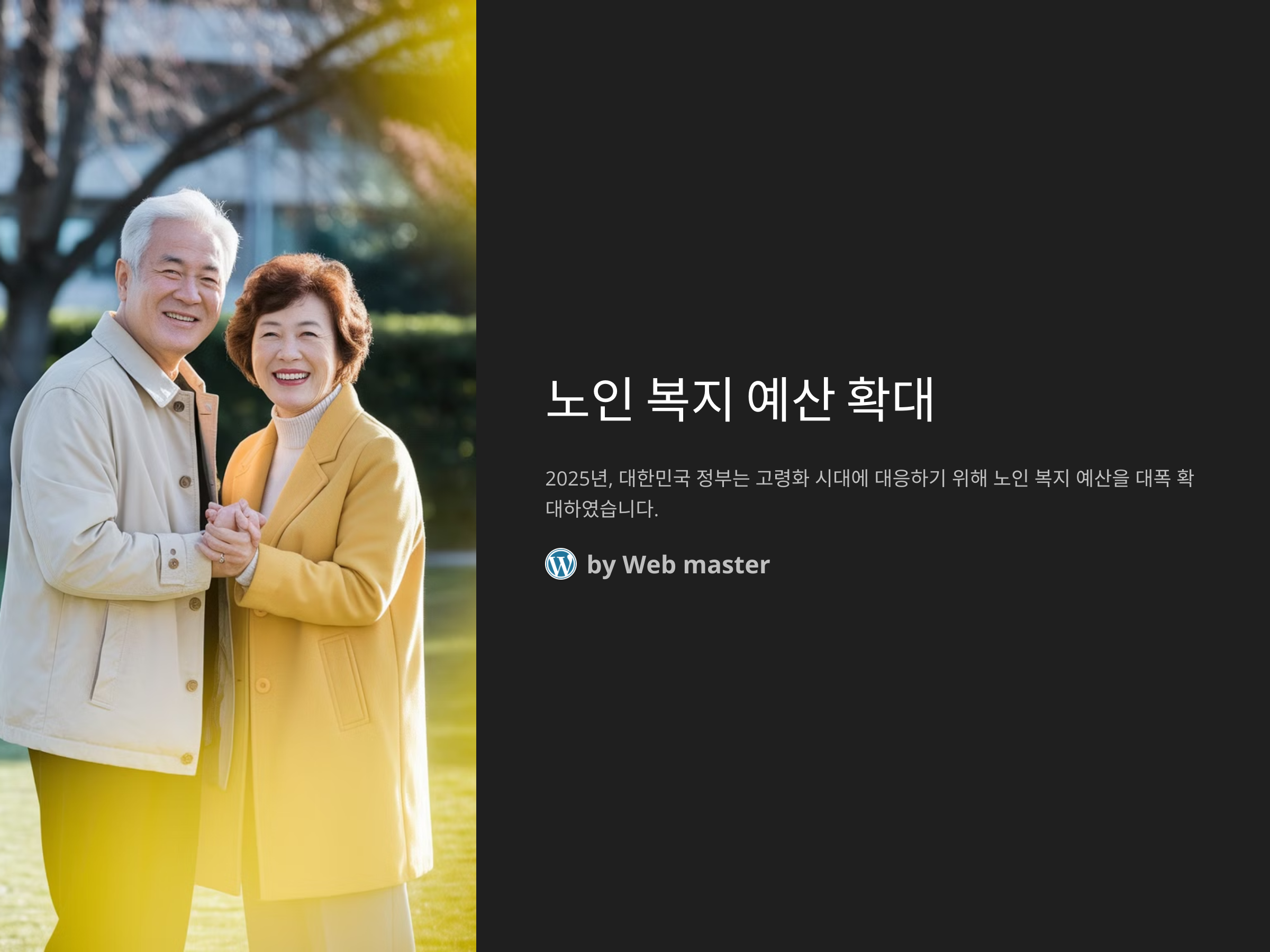 노인 복지 예산 확대는 대한민국이 고령화 사회를 대비하는 중요한 첫걸음입니다. 기초연금 인상, 의료비 지원, 노인 일자리 창출 등 다양한 정책이 시행되면서 노인들의 삶의 질이 한층 개선될 것으로 기대됩니다.