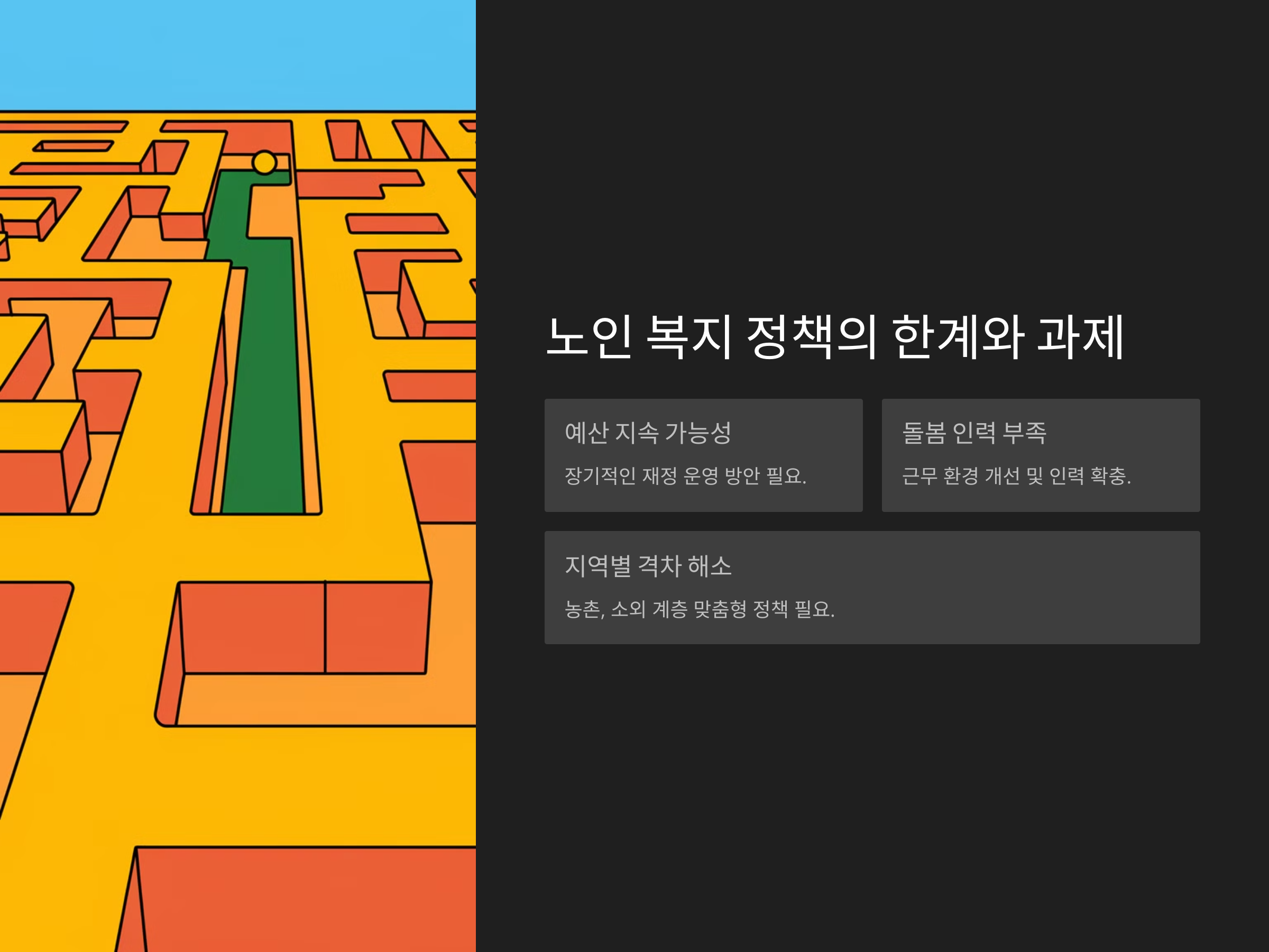 노인 복지 예산 확대에도 불구하고 여전히 해결해야 할 문제들이 남아 있습니다.